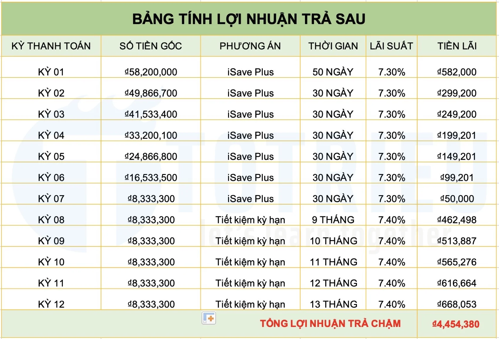 Như vậy, với khoản mua trả góp 12 tháng, thực tế Tôi được trả trong 13 tháng và nhờ BÍ KÍP nhỏ này, Tôi có khoảng 4.454.380đ lãi từ việc trì hoãn các khoản trả chậm.