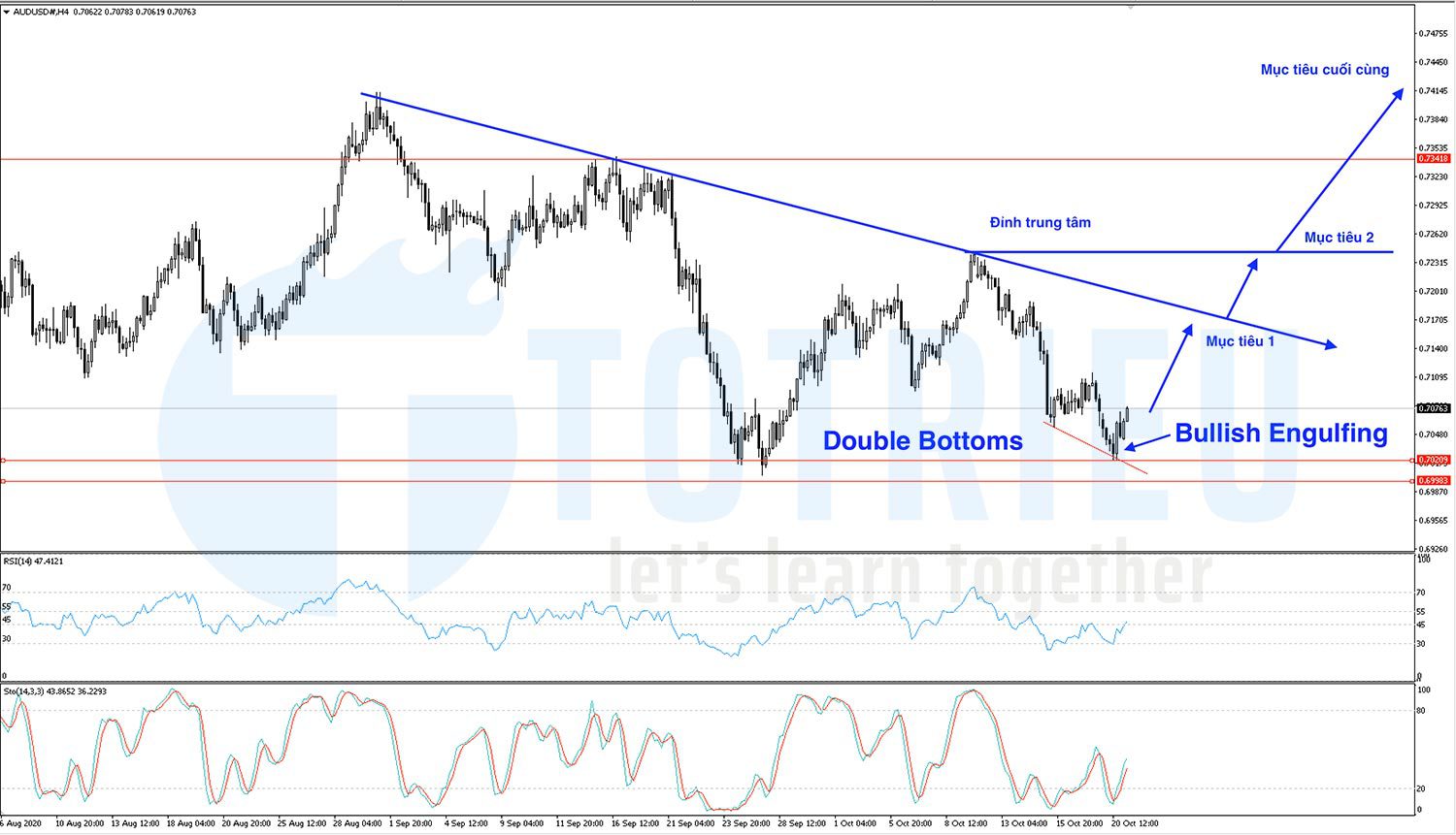 Đáy thứ hai của Mô hình tại 0.7000 phiên Châu Á ngày 21-10-2020 đã hình thành Mô hình nến Bullish Engulfing báo hiệu khả năng 0.7000 có thể là đáy và tỷ giá Bounce khoảng 50pips từ ngay vùng hỗ trợ quan trọng.