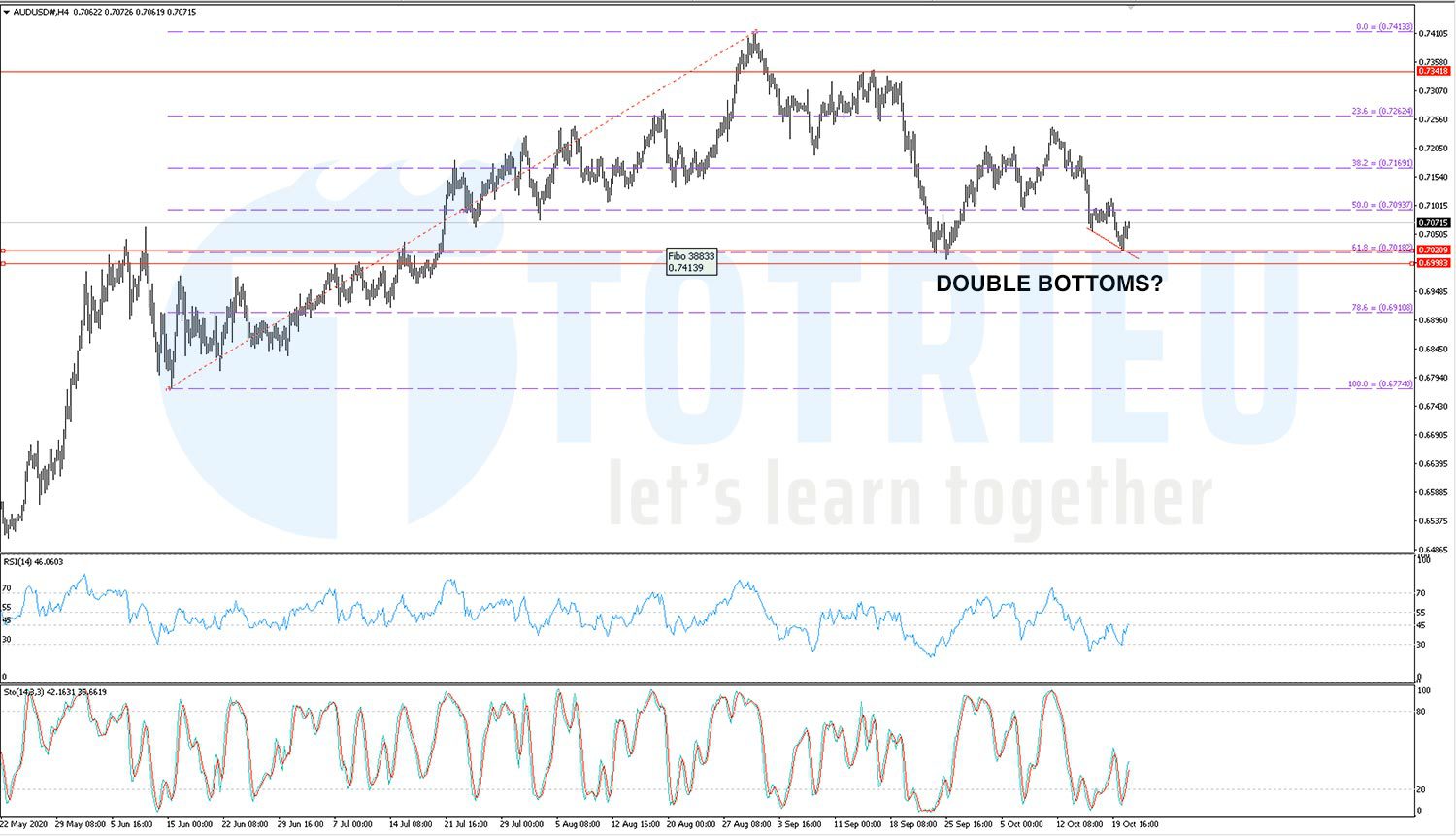 Biểu đồ 4 giờ của AUDUSD ngày 21-10-2020 hình thành rất rõ trạng thái của Mô hình Double Bottoms rất lớn.