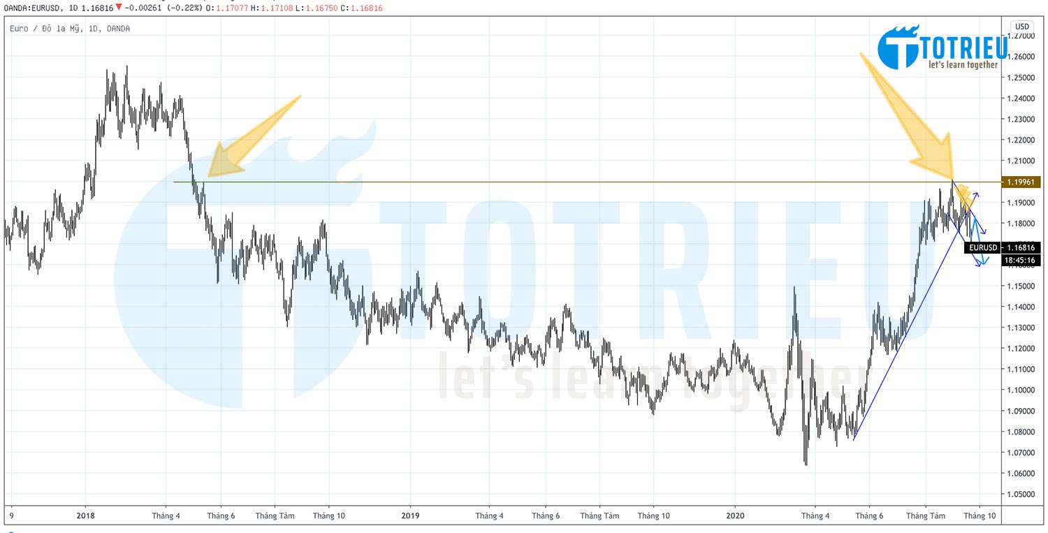 Vùng giá 1.2000 Cũng là vùng giá quan trọng bởi vì chúng ta nhìn thấy mức tỷ giá này lần cuối cùng trên biểu đồ là vào ngày 14-05-2018, cách đây khoảng 2 năm.