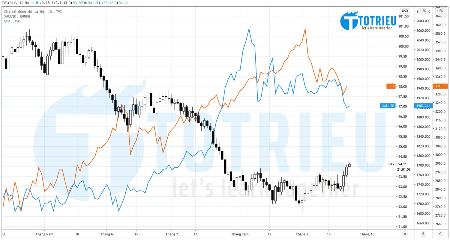 Và một rủi ro khác chúng ta vừa nói ở trên, đó chính là QUẢ BOM từ thị trường chứng khoán. Thị trường chứng khoán càng tăng, Vàng càng tăng, USD càng giảm.