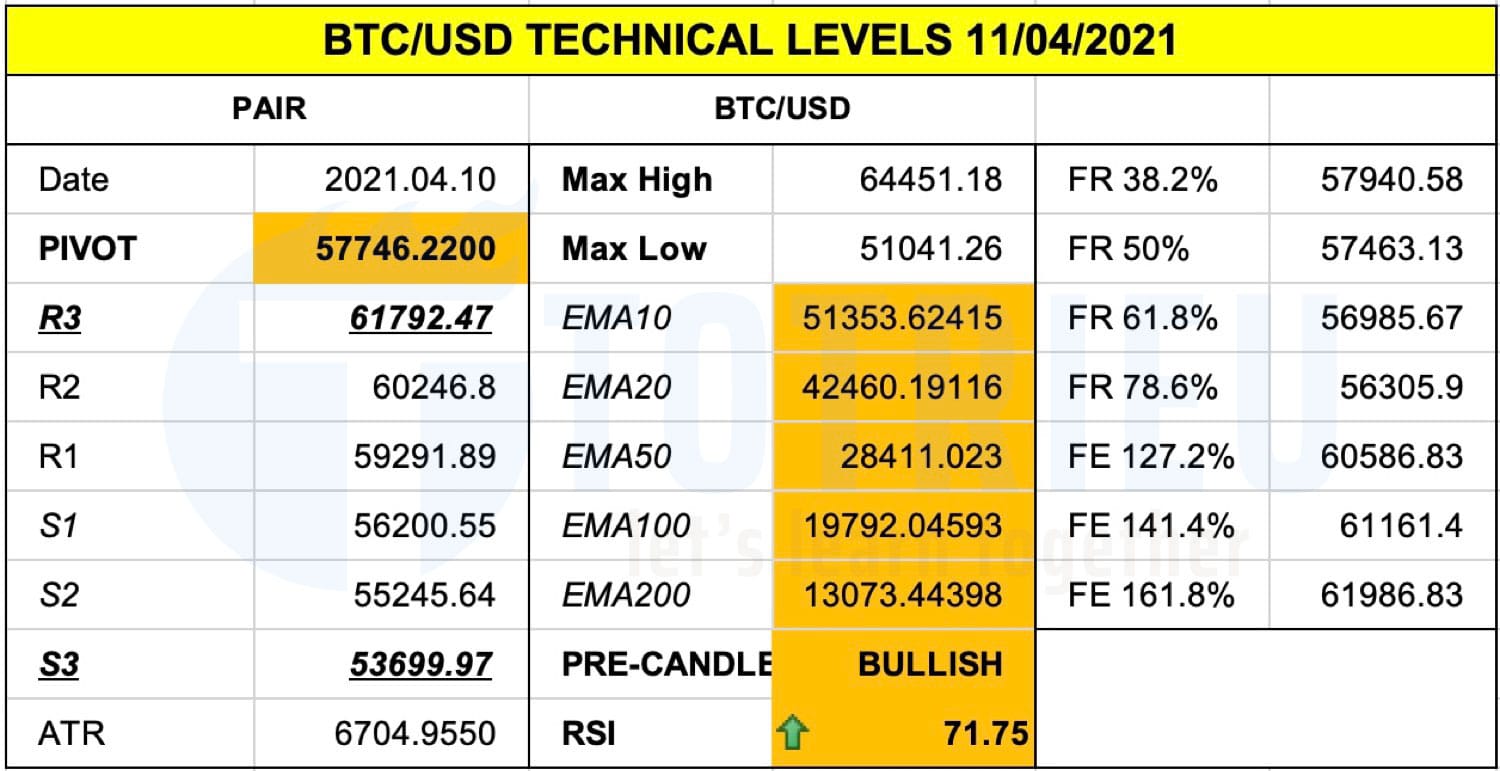 Với các tín hiệu kỹ thuật và cơ bản thế này, Tôi cho rằng ngày 11-04-2021, Bitcoin sẽ có khả năng bị đánh lên tại $59619 với mục tiêu $60896 và $61792.