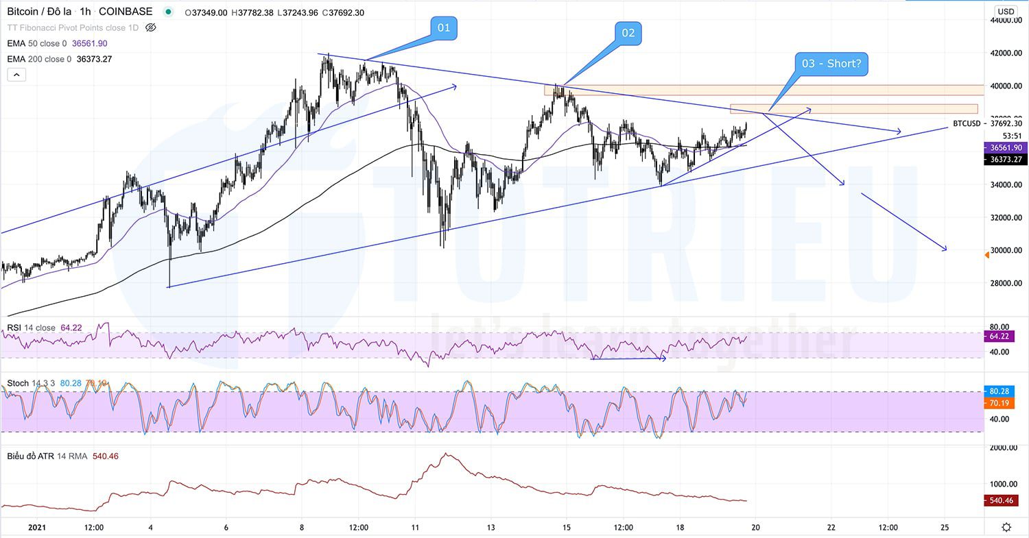 Các dấu hiệu cho thấy $38996 có thể sẽ là đỉnh thứ ba được thể hiện trên biểu đồ 1 giờ đến từ RSI và Stochastic.