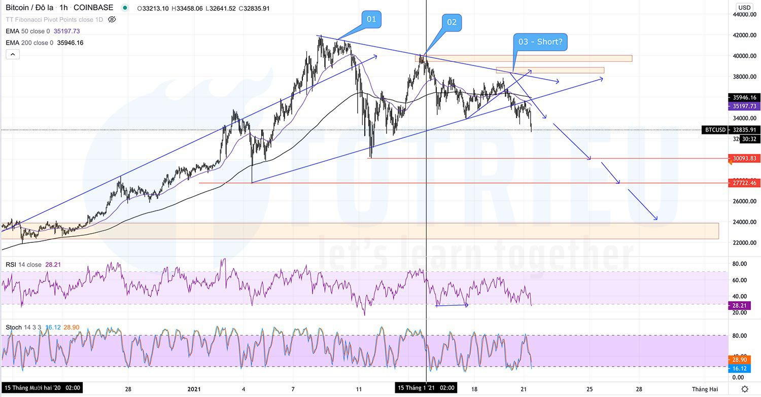 Tam giác cân trên biểu đồ kỹ thuật 1 giờ của Bitcoin hình thành và được duy trì từ đầu tháng 01 năm 2021 cho tới hiện tại. Một vùng tam giác rộng lớn và có thể sẽ tạo ra đợt điều chỉnh thứ hai của Bitcoin với mức giá tạo đáy lần này nguy cơ giảm xuống dưới $30000.