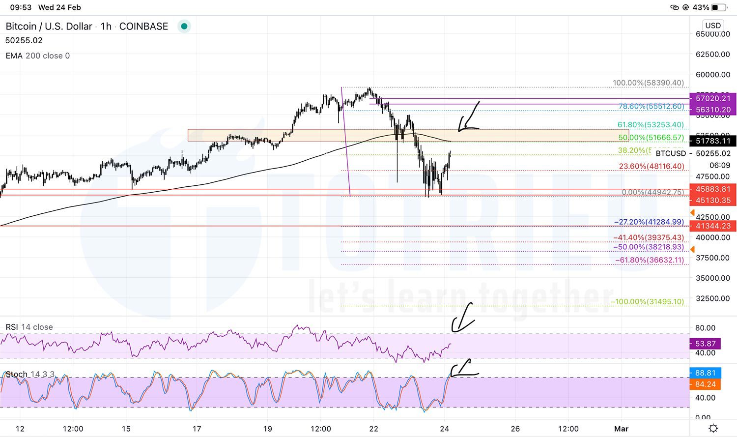 Bitcoin – BTCUSD ngày 24-02-2021 sau khi có cú sụt giảm mạnh về $45000 thì đang nỗ lực phục hồi lên trên mức $50000.