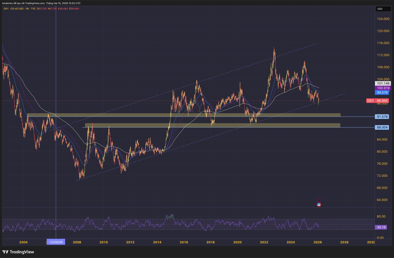 Đồng USD đã trải qua năm 2025 khó khăn dưới thời Tổng thống Trump và có thể sẽ còn tiếp tục khó khăn trong năm 2026. Và biểu đồ kỹ thuật khung tuần chỉ số sức mạnh đồng USD sẽ là biểu đồ đáng quan sát nhất: