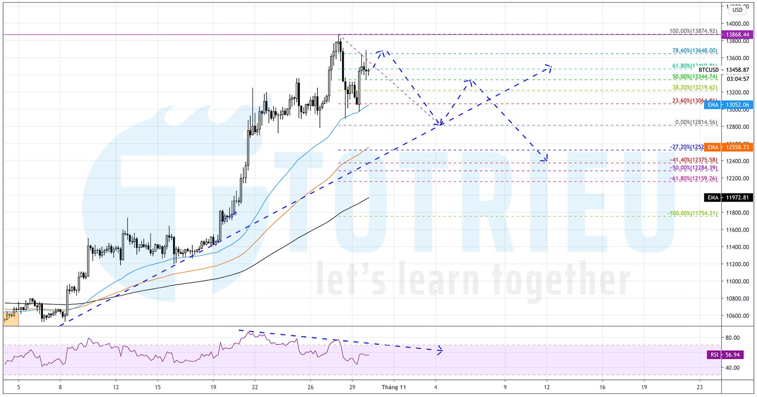 Bitcoin – BTCUSD tháng 11-2020 đang tạo đỉnh trong hơn 1 năm tại vùng giá $13868. Ngay khi tạo đỉnh tại vùng giá này, Bitcoin đã xuất hiện các phản ứng tương đối mãnh liệt.