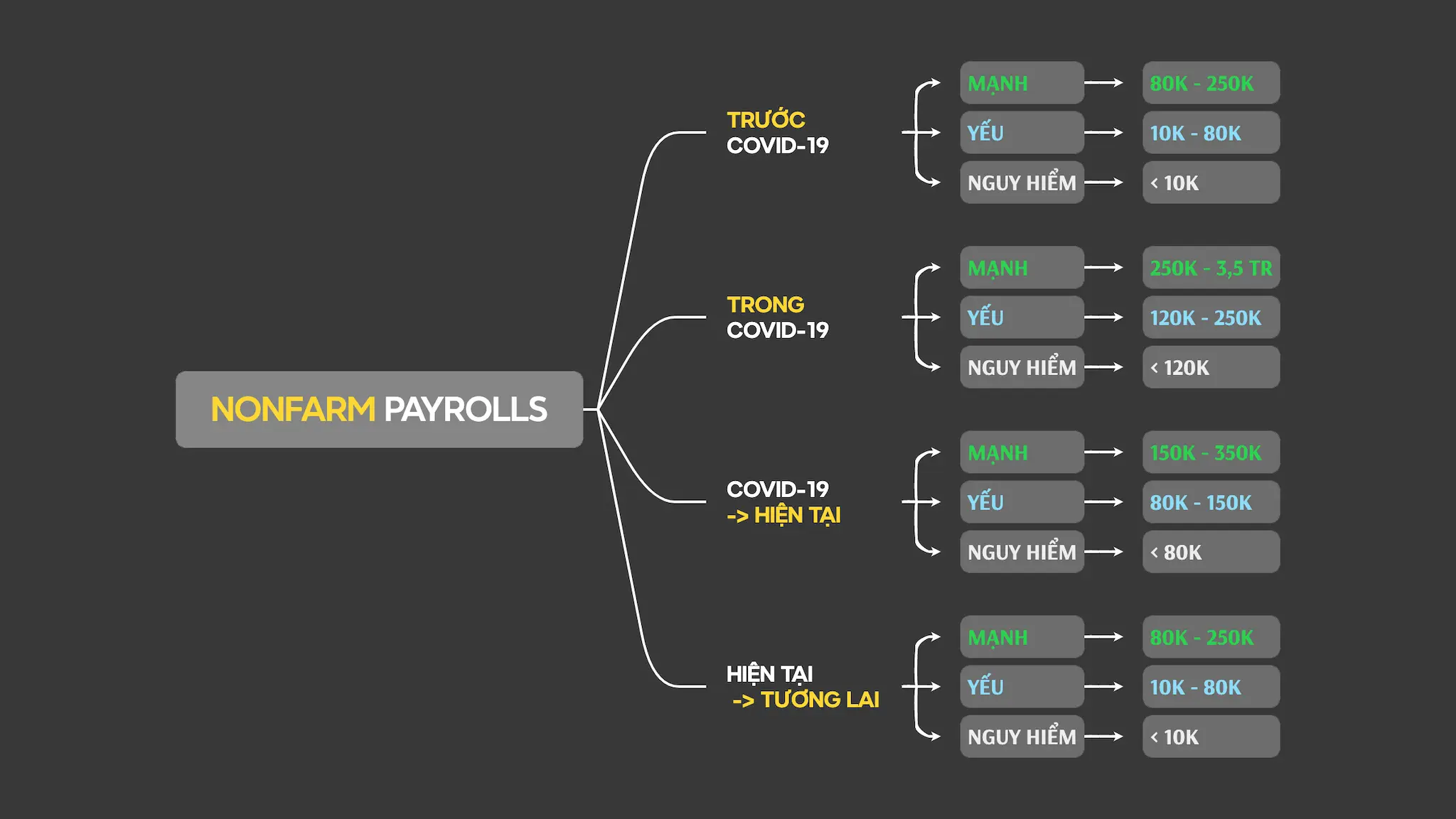 Tuy nhiên, ý nghĩa của NFP không phải lúc nào cũng cố định. Qua từng giai đoạn, đặc biệt trước – trong và sau COVID-19, các ngưỡng “mạnh – yếu – nguy hiểm” của số liệu này đã thay đổi đáng kể. Vì vậy, nhà đầu tư cần điều chỉnh góc nhìn khi phân tích báo cáo.