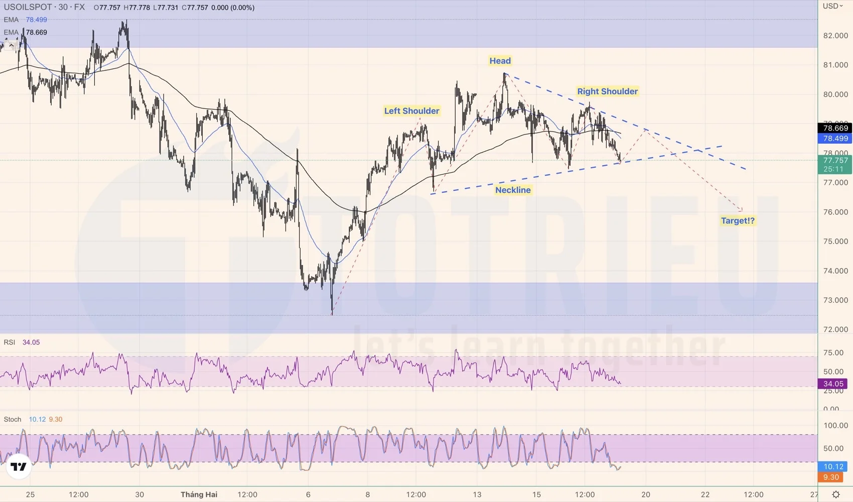 Biểu đồ kỹ thuật cho thấy Cụm mô hình lớn báo hiệu khả năng tiếp tục điều chỉnh là Vai – Đầu – Vai thuận với vùng vai trái ở $78.66, Vùng head ở $80.89 và vùng vai phải đã hoàn thiện ở $79.10.