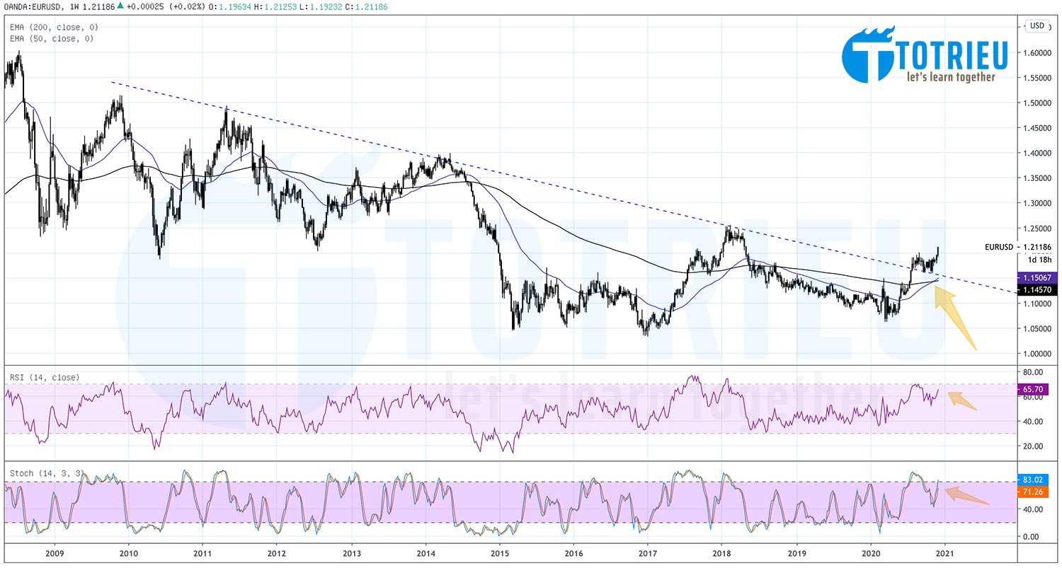 Biểu đồ kỹ thuật hàng tuần EURUSD tháng 12-2020 cũng cùng cho tín hiệu tương tự như biểu đồ tháng.