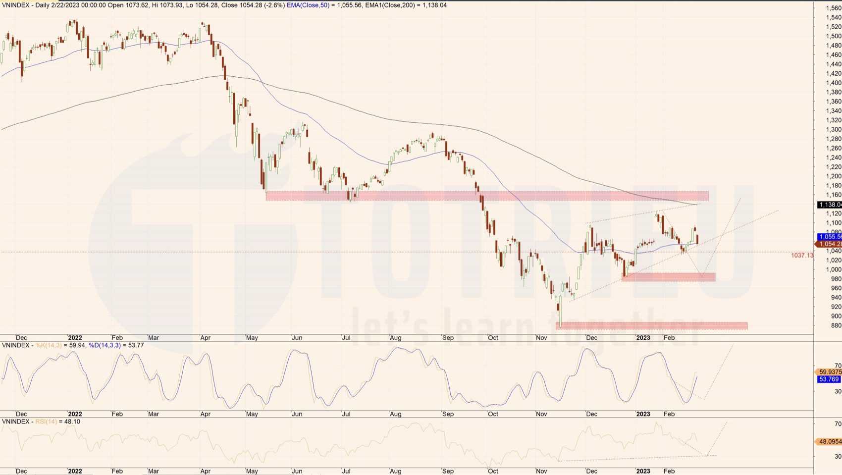 Tôi cho rằng VNINDEX sẽ có thể có đợt phục hồi nhẹ khi RSI tiếp cận vùng Oversold tại 30. Đó là thời điểm có tiềm năng lòng tham sẽ được kích hoạt vì lần gần nhất mà RSI Oversold là 16-17/11/2022 tức đã cách đây 3 tháng. Vùng tiềm năng Oversold sẽ nằm ở 983 – 1000 điểm. Hãy để tâm tới vùng giá này bởi nó cũng sẽ có thể tạo Double Bottoms và hình thái Higher Low.