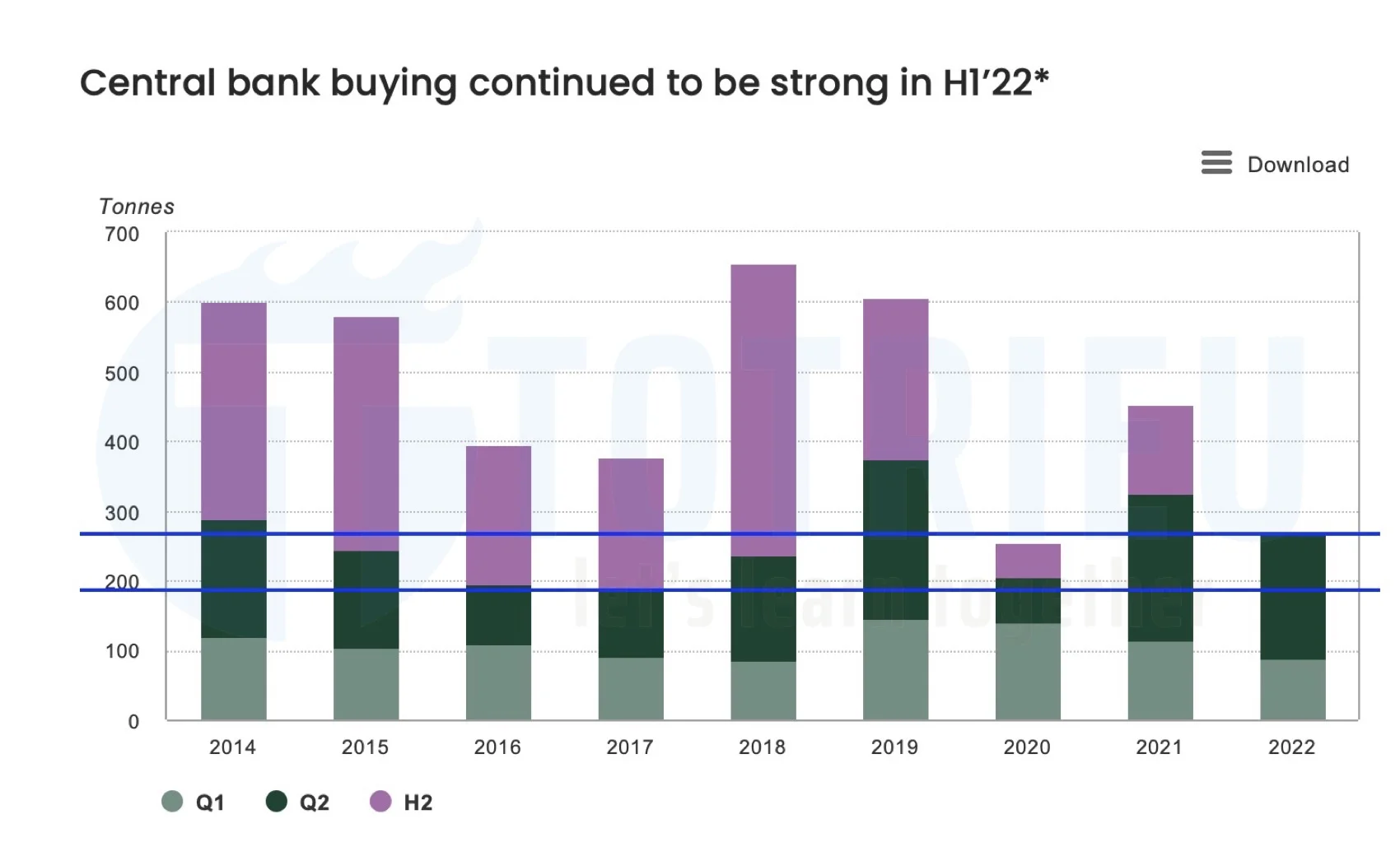Theo thống kê từ tổ chức Vàng thế giới, 6 tháng đầu năm 2022 chứng kiến các NHTW mua ròng vàng và thuộc Top cao nhất kể từ năm 2014.