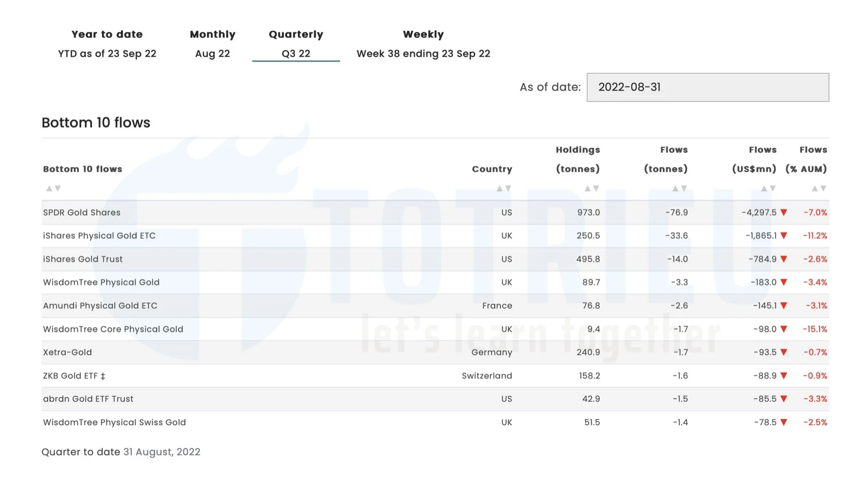 Trọng điểm là ông SPDR đã xả ròng vào tháng 08-2022 là 32.5 tấn. Q3-2022 tính tới 31-08, SPDR xả tổng 76 tấn. Xếp thứ 2 là ông iShares Physical Gold ETC với lượng xả trong Q3 tới 31-08 là 33.6 tấn.