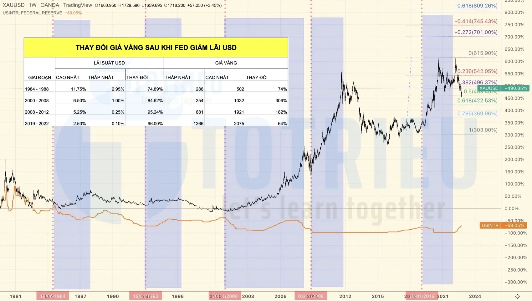 Dữ liệu lịch sử đã cho thấy sau mỗi đợt the FED tăng lãi suất mạnh và quay đầu giảm, vàng đều có mức tăng trưởng khủng khiếp từ 64% – 306% và chu kỳ tăng trưởng sẽ kéo dài từ 2-4 năm hoặc thậm chí 8 năm.