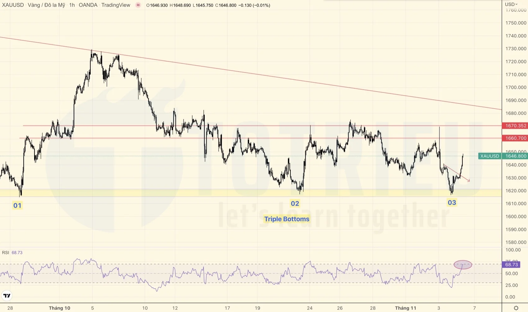 Trên biểu đồ kỹ thuật khung H1, Vàng tạo Triple Bottoms và mô hình vai – đầu vai ngược sau đó Recover từ 1616.16 lên mức giá hiện tại là 1645.96.