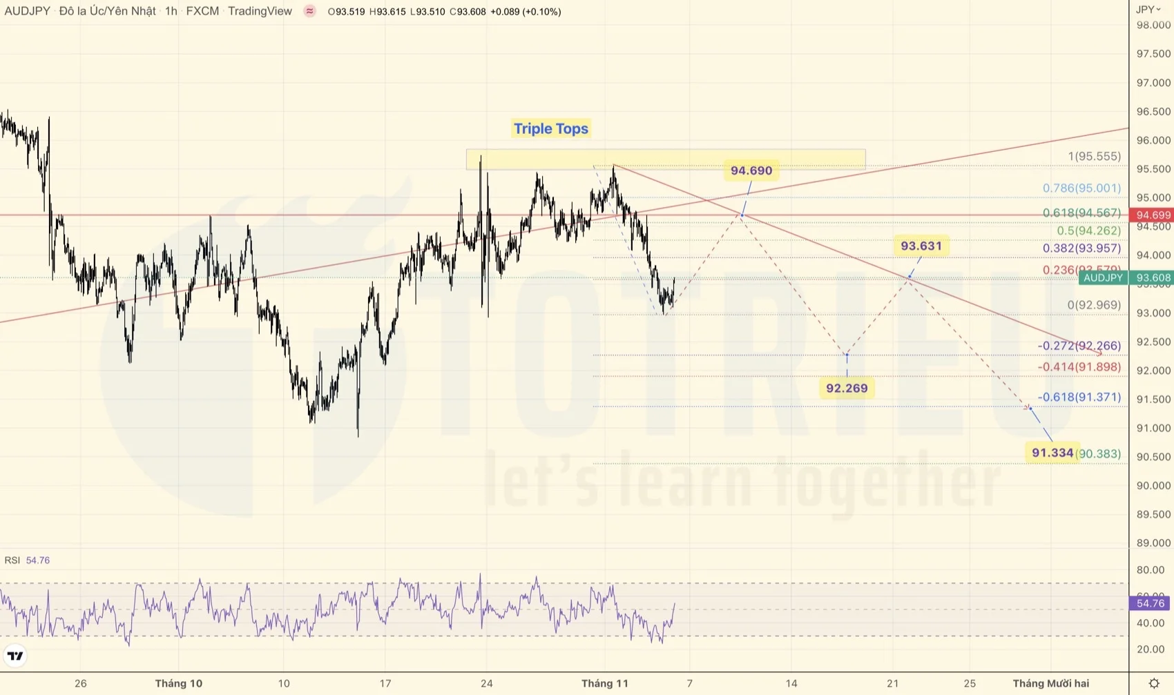 AUDJPY có Triple Tops ở ngay vùng Fibo 61.8% – 95.69 của đợt giảm mạnh trước đó từ 98.60 về 90.82 cho thấy Áp lực giảm giá mạnh vẫn đè nặng lên cặp tiền tệ này.