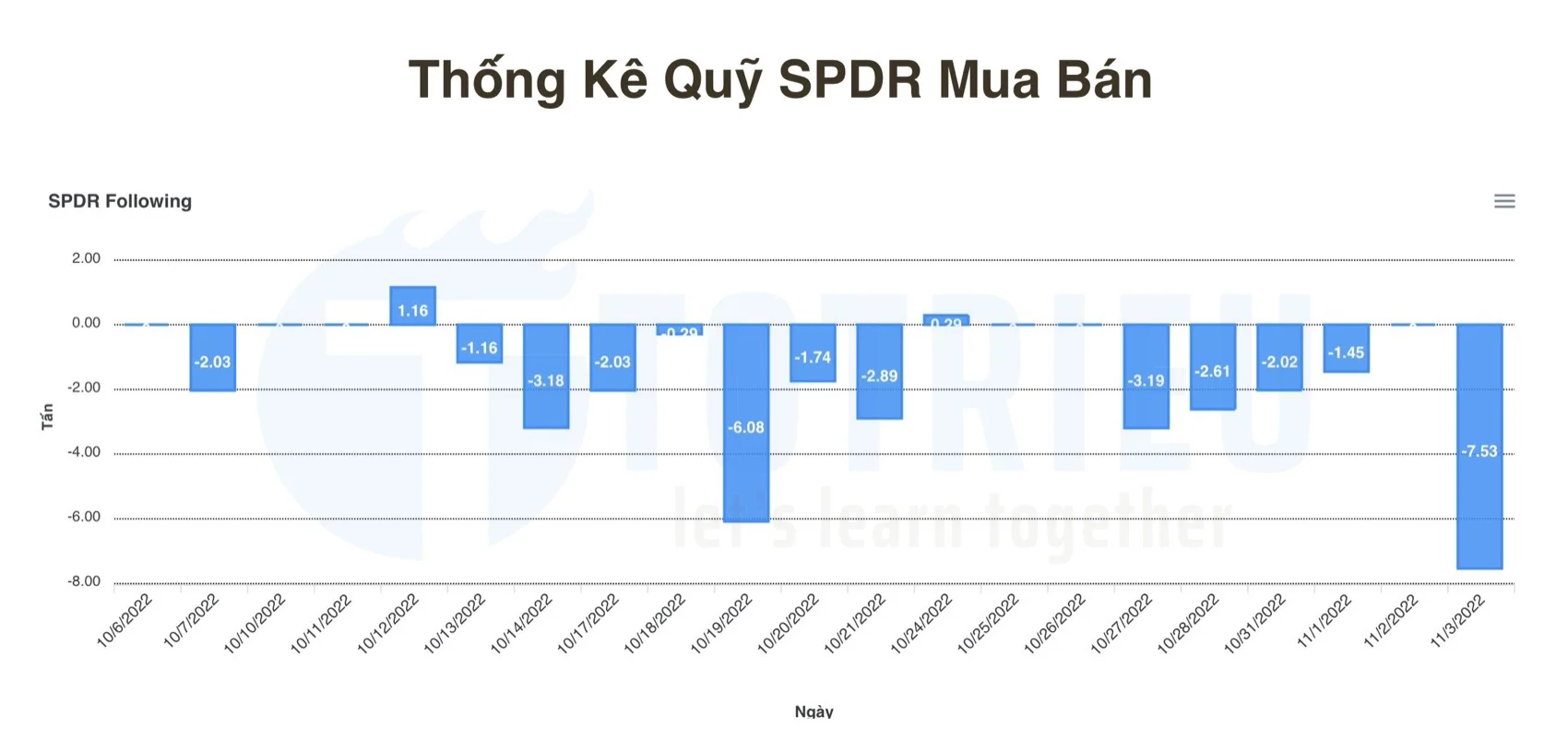 Xem xét các quỹ lớn mua bán thì Xu hướng bán ròng vẫn là chủ đạo. Riêng SPDR ngày 03/11/2022 đã có cú xả mạnh mẽ hơn 7.5 tấn.