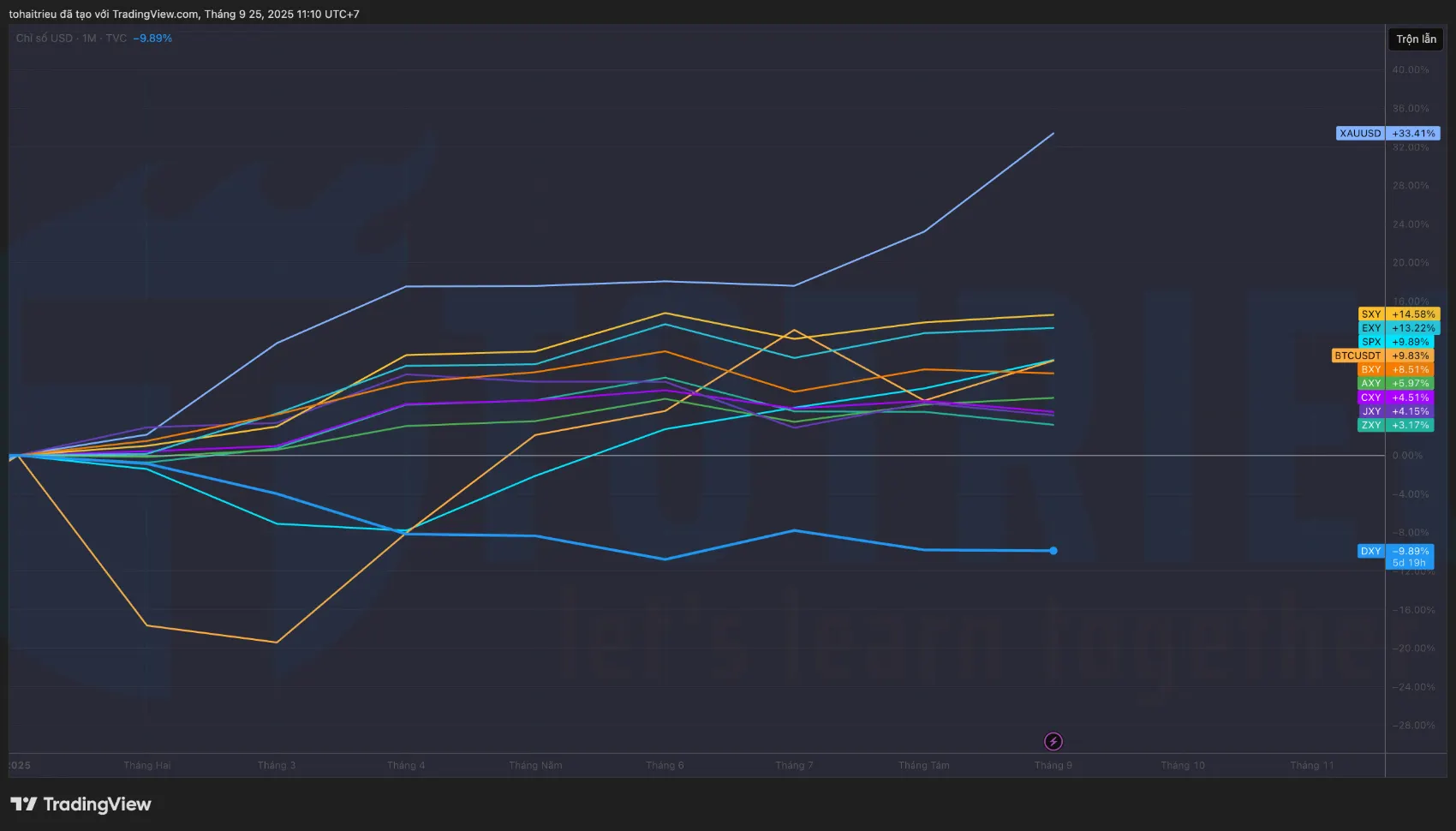 Từ đầu năm, USD Index đã giảm khoảng 9,89%. Gold tăng 33.41% là loại tài sản có hiệu suất tốt nhất trong năm khi vượt qua Bitcoin (+9.83%) và Chứng khoán (+9.89%).