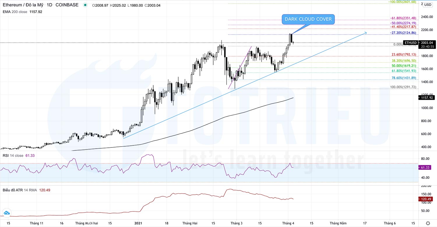 Tôi đang muốn giao dịch với Dark Cloud Cover xuất hiện trên biểu đồ kỹ thuật ETHUSD ngày 04-04-2021 tuy nhiên nếu như vậy thì sẽ vô cùng mạo hiểm.