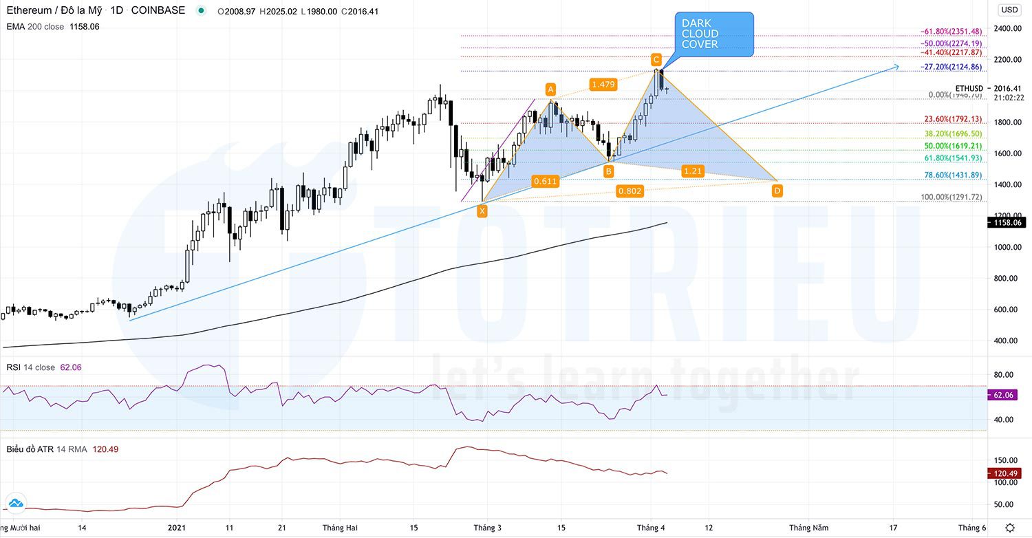 Ethereum – ETHUSD ngày 04-04-2021 đang xuất hiện Mô hình Dark Cloud Cover – Mây đen bao phủ tại Fibonacci Extension 127.2% cảnh báo nguy cơ điều chỉnh tạo Harmonic Cypher để tiếp diễn xu hướng tăng.