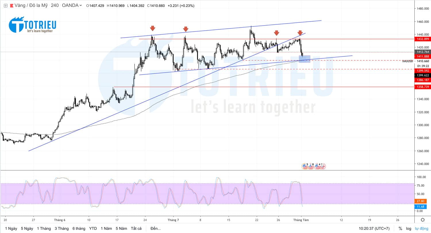 XAU/USD liên tục thử thách vùng giá 1432 và vùng giá này dường như trở thành một kháng cự khá vững chắc. Phiên Tokyo ngày 01/08/2019, Gold đã có lúc sụt giảm về 1404.39 và biến động trong Ascending Channel.