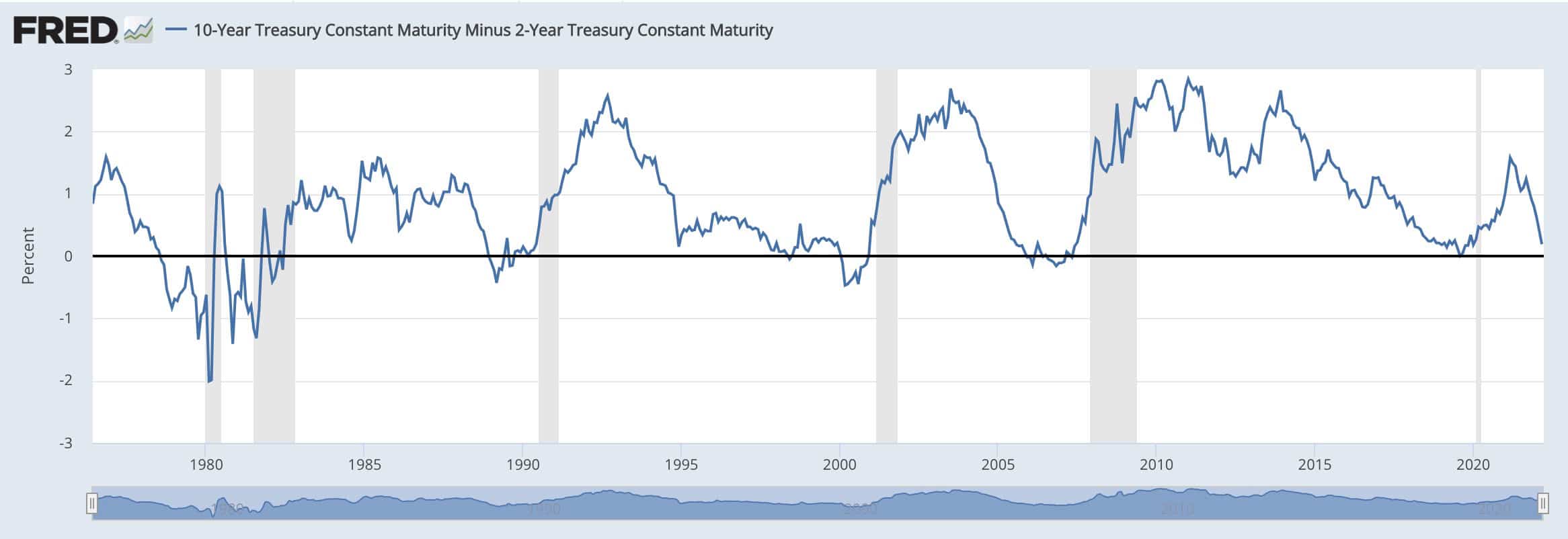 Ở 3 lần gần nhất, Khi Đường cong Lợi tức trái phiếu kho bạc 10Y/2Y phẳng và bị đảo ngược, các cuộc suy thoái tồi tệ là hệ quả theo sau.