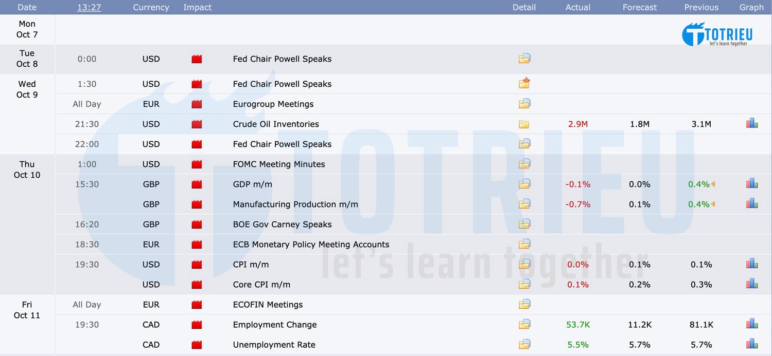 Lịch kinh tế tuần 41/2019 không có quá nhiều các sự kiện quan trọng có khả năng tác động lên thị trường. Chúng ta chỉ xem lại số liệu này sau đó sẽ kết hợp với từng cặp tiền theo một cách trình bày mà Tô nghĩ bạn sẽ dễ hiểu hơn.