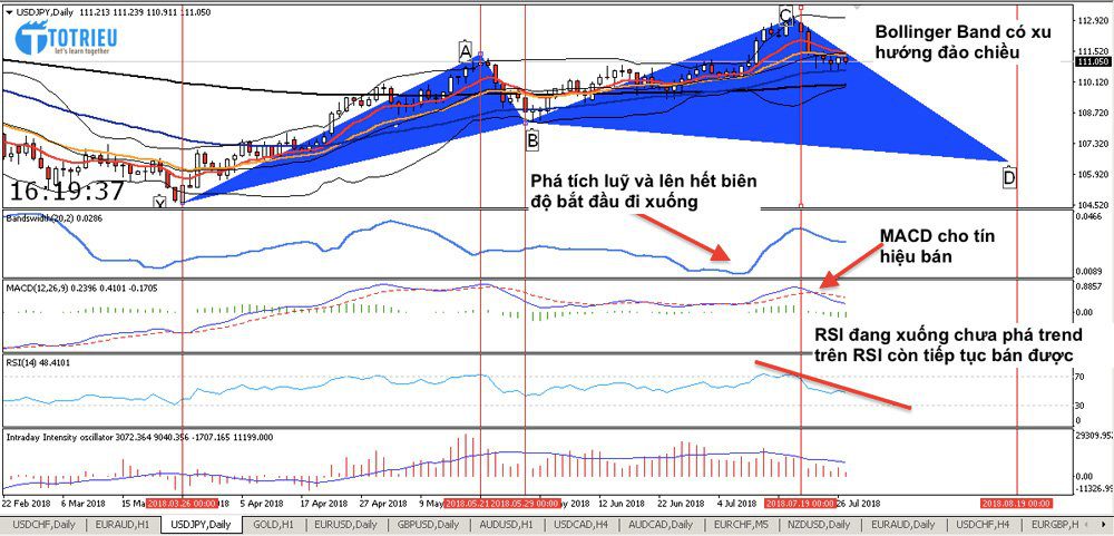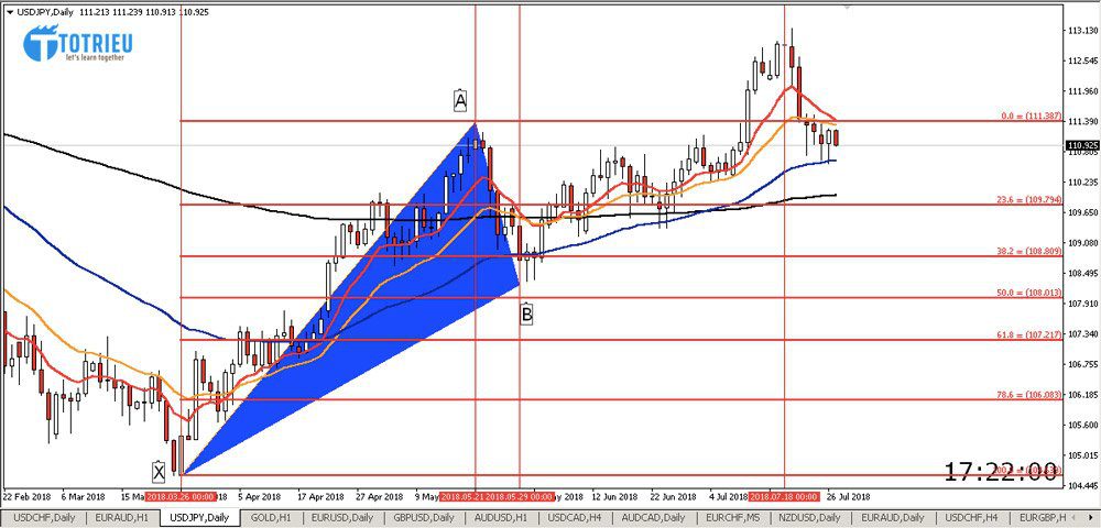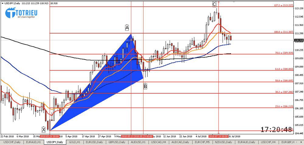 Cạnh BC: Tới B, tỷ giá lại tiếp tục xu hướng cũ là Tăng mạnh mẽ. Và khúc này, ngay cả Tô cũng bị nó lừa nhiều lần vì không tin Fibonacci Retracement. Tỷ giá đã phi lên chạm sát mức Fibonacci Extension 127.2% của cạnh XA vào ngày 18/07/2018 hình thành một cây Doji tại mốc tỷ giá 113.22. Hình thành điểm C và hoàn thành cạnh BC