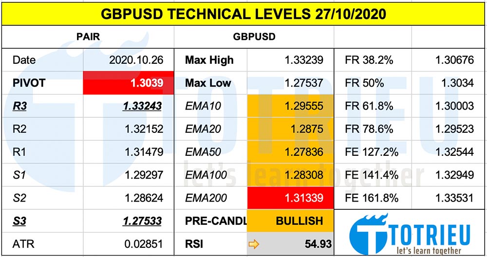 Biểu đồ kỹ thuật GBPUSD ngày 27-10-2020 cho góc nhìn chi tiết hơn. Trước đó, khi tiếp cận vùng kháng cự mạnh tại 1.3460 – 1.3500, GBPUSD đã sụt giảm rất nhanh.