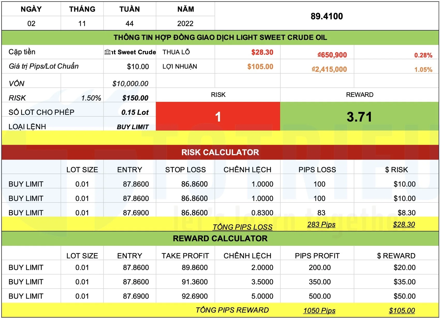 Ngày 02-11-2022, Tôi dự kiến mua dầu WTI tại giá từ $87.86 với mục tiêu $90 và $92.60/thùng.