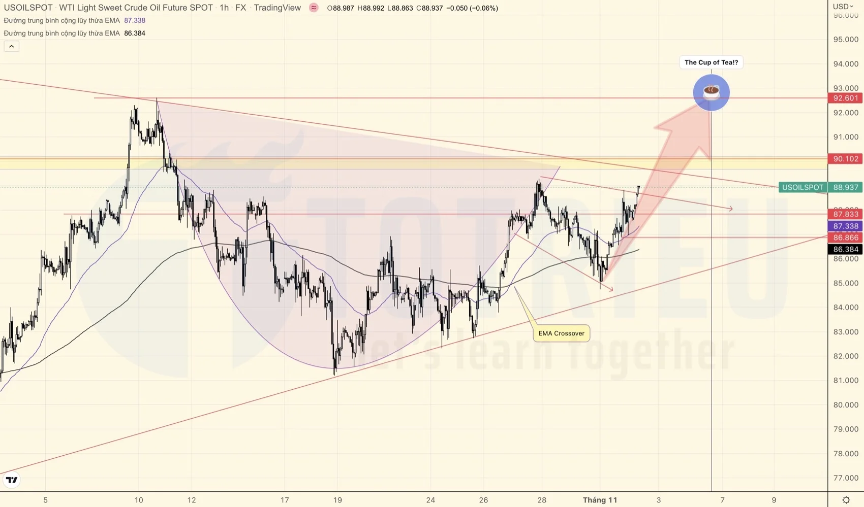 The Cup and Handle với mức giá cao nhất được xem xét là $92.60/thùng sẽ là mục tiêu tiếp theo của phe Bull.