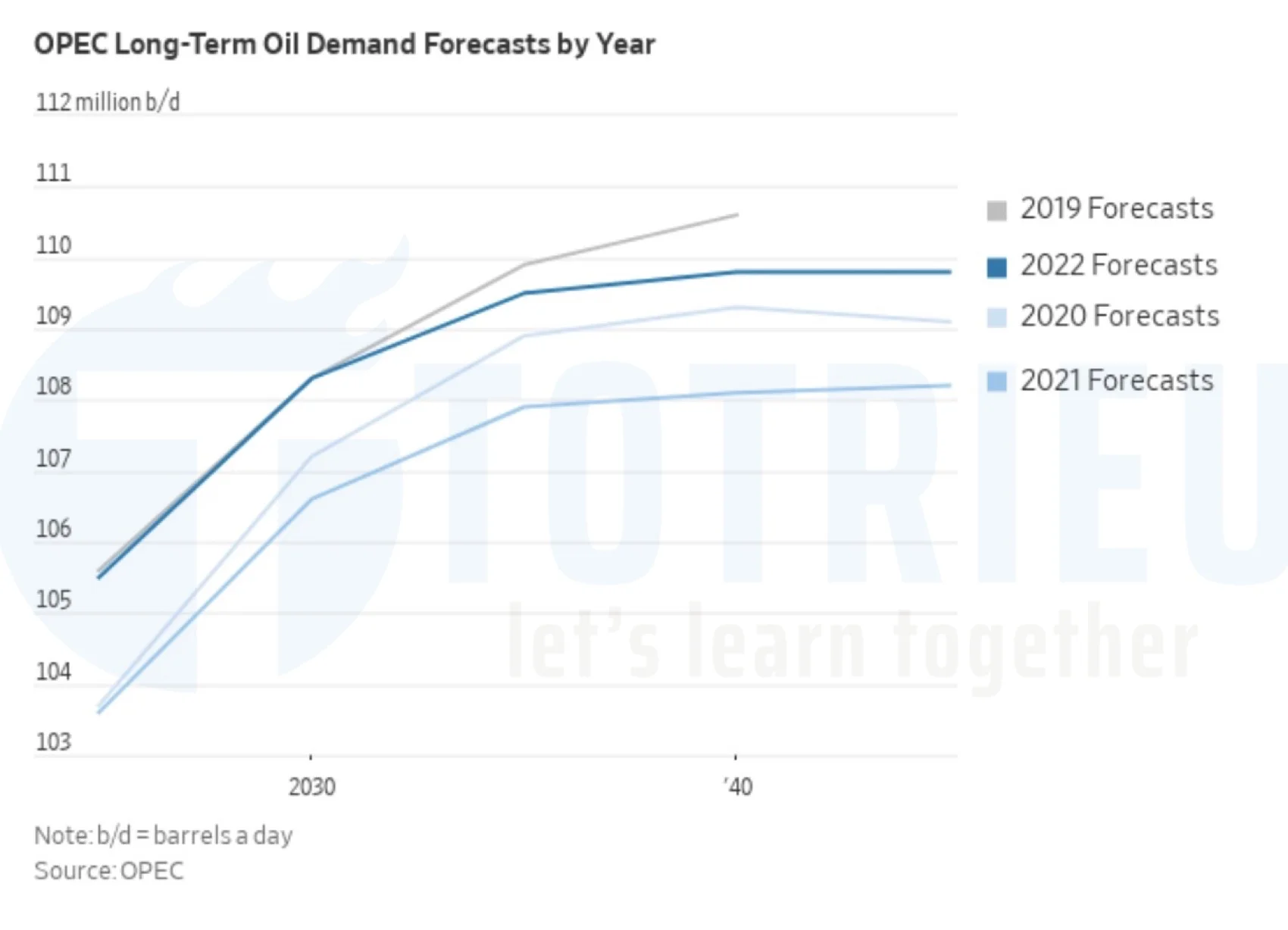 Dự báo nhu cầu dầu mỏ từ 2022-2040 cho từ OPEC cho thấy Nhu cầu vẫn sẽ tăng dần và tới thời điểm năm 2030 nhu cầu sẽ đạt ngưỡng 108.5 triệu thùng mỗi ngày trong khi Khả năng tăng sản lượng của khối OPEC là có giới hạn. Để vượt giới hạn hiện tại, Lộ trình của OPEC sẽ cần tối thiểu tới 2025.
