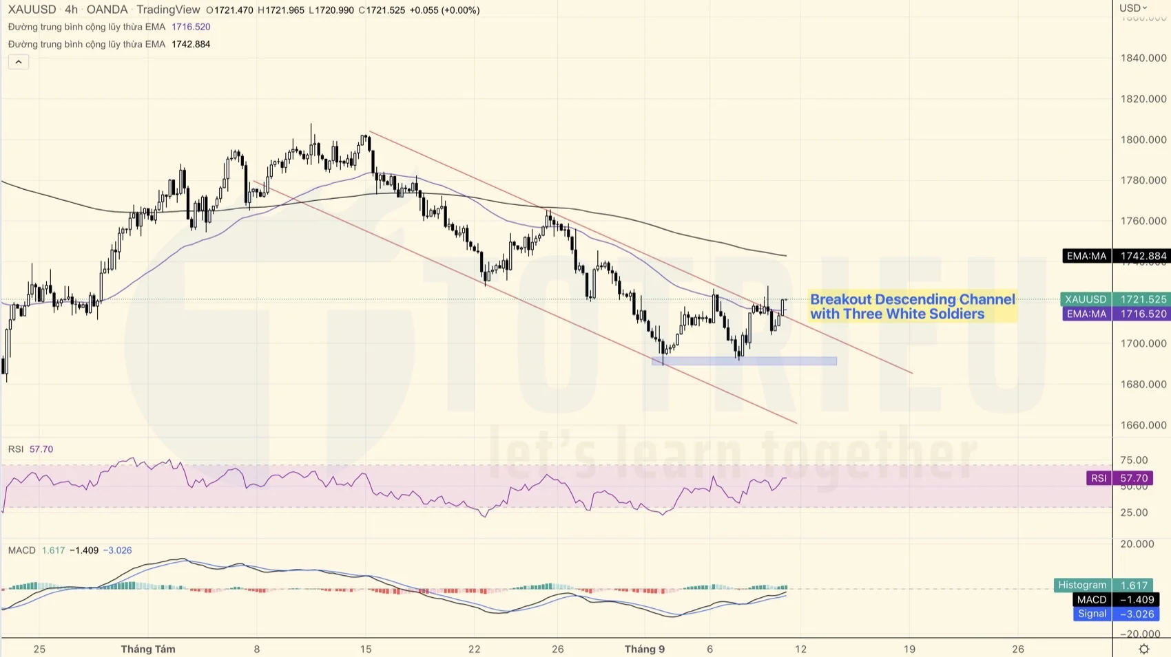 Biểu đồ kỹ thuật Giá Vàng thiết lập kênh giá giảm được duy trì từ giữa tháng 08-2022 tới hiện tại. Và trong phiên Á ngày 09-09, Vàng có tín hiệu Breakout kênh giá giảm này với các tín hiệu chính: