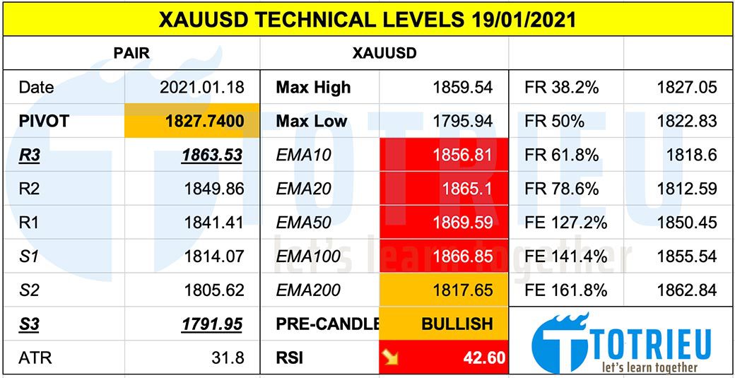 Thông số kỹ thuật XAUUSD ngày 19-01-2021