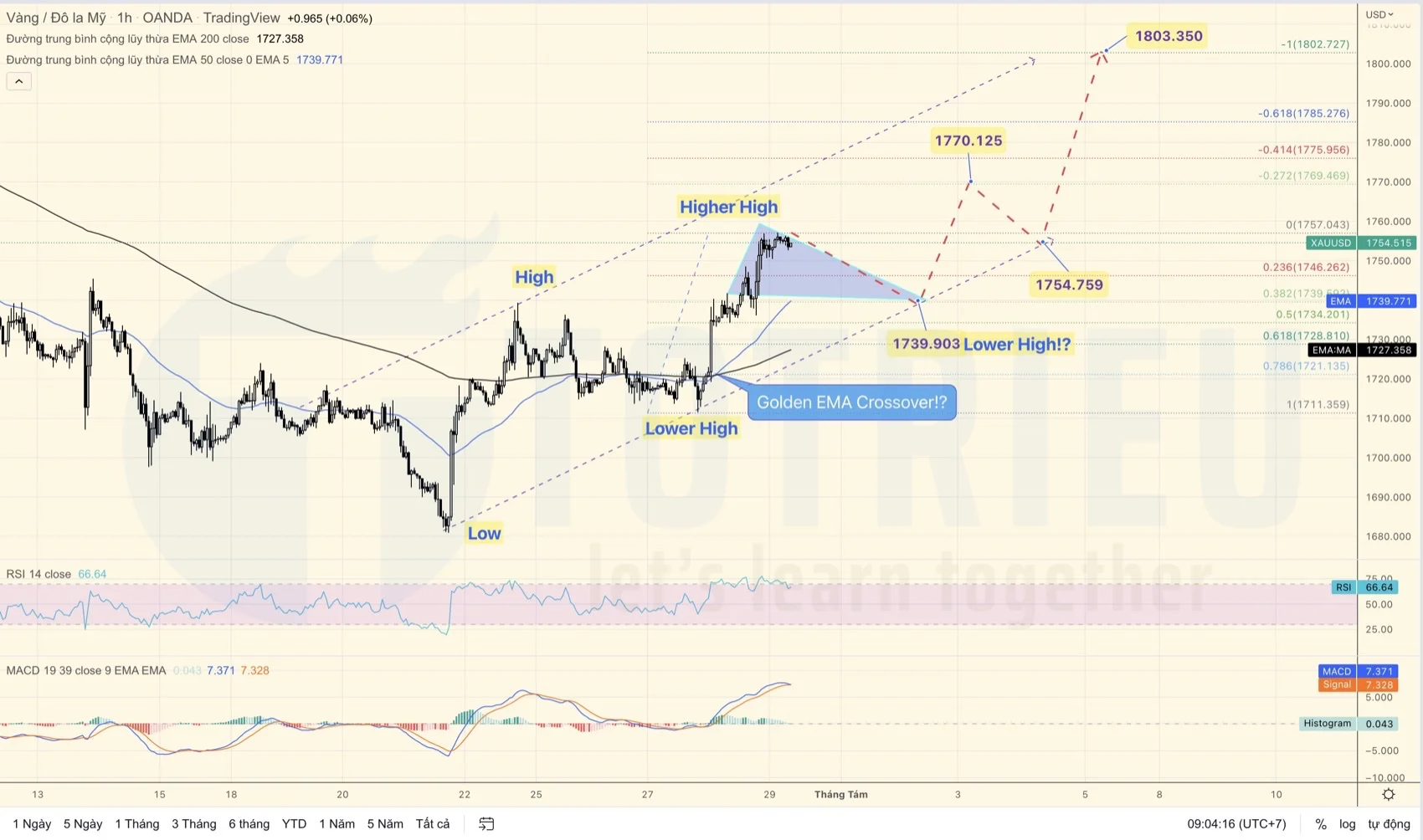 Đợt tăng thứ hai tạo Lower High – Higher High: Tăng từ $1710 (LH) tới $1757 (HH) là đợt tăng hiện tại.
