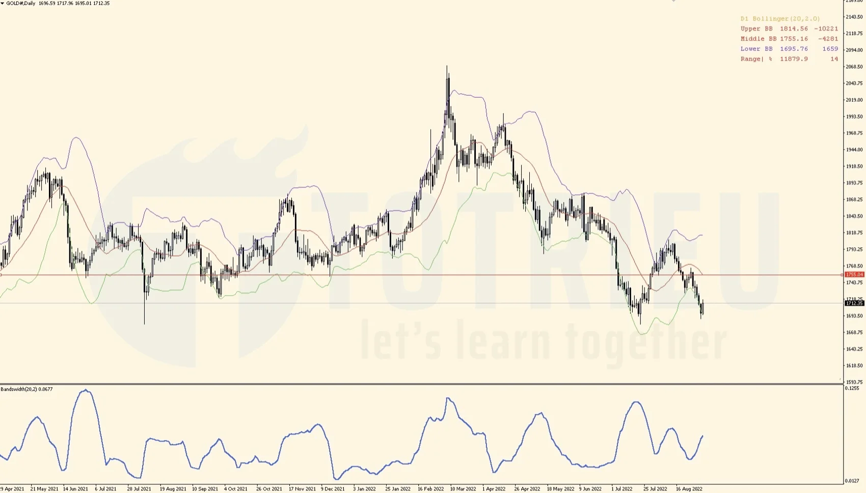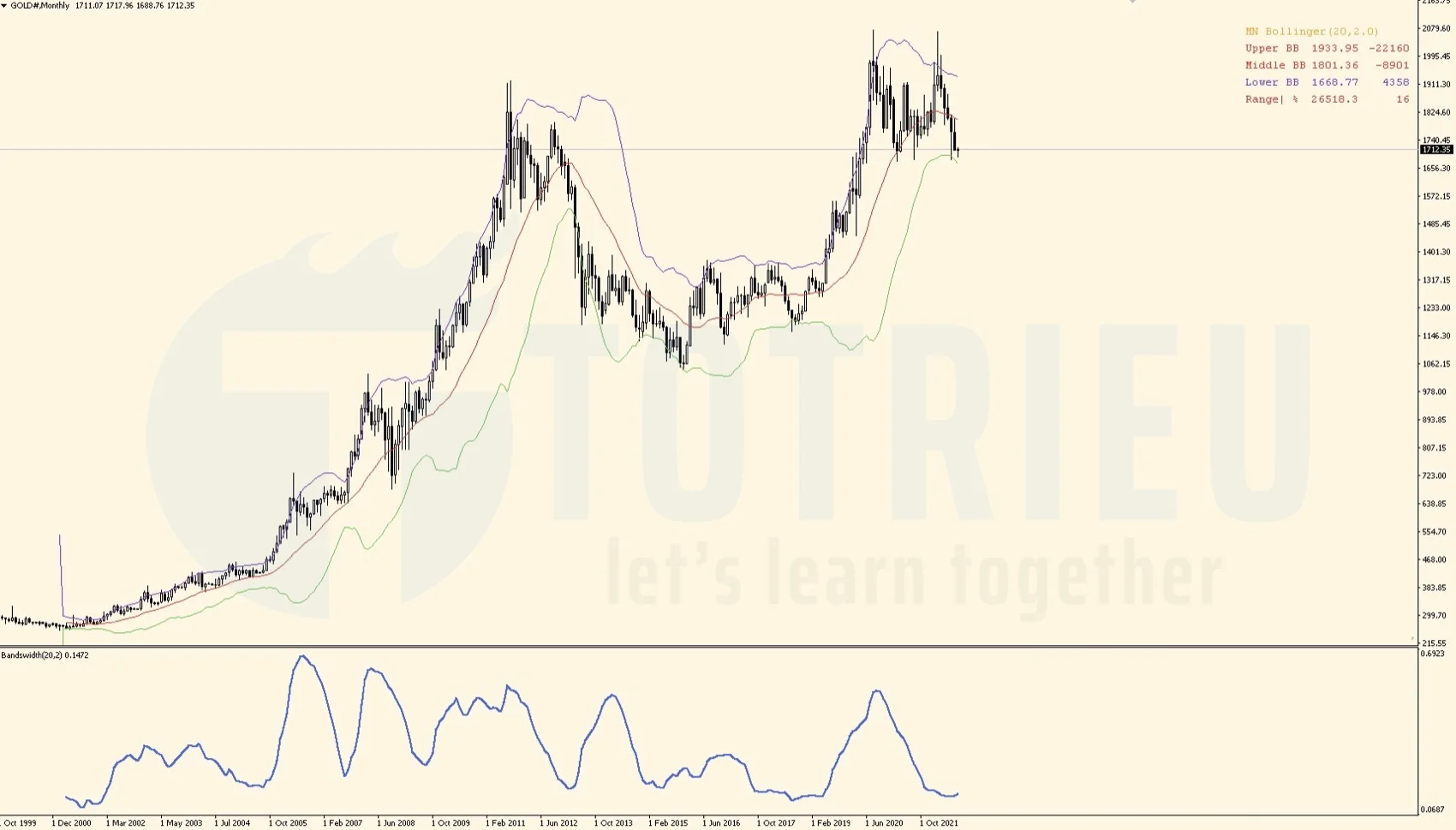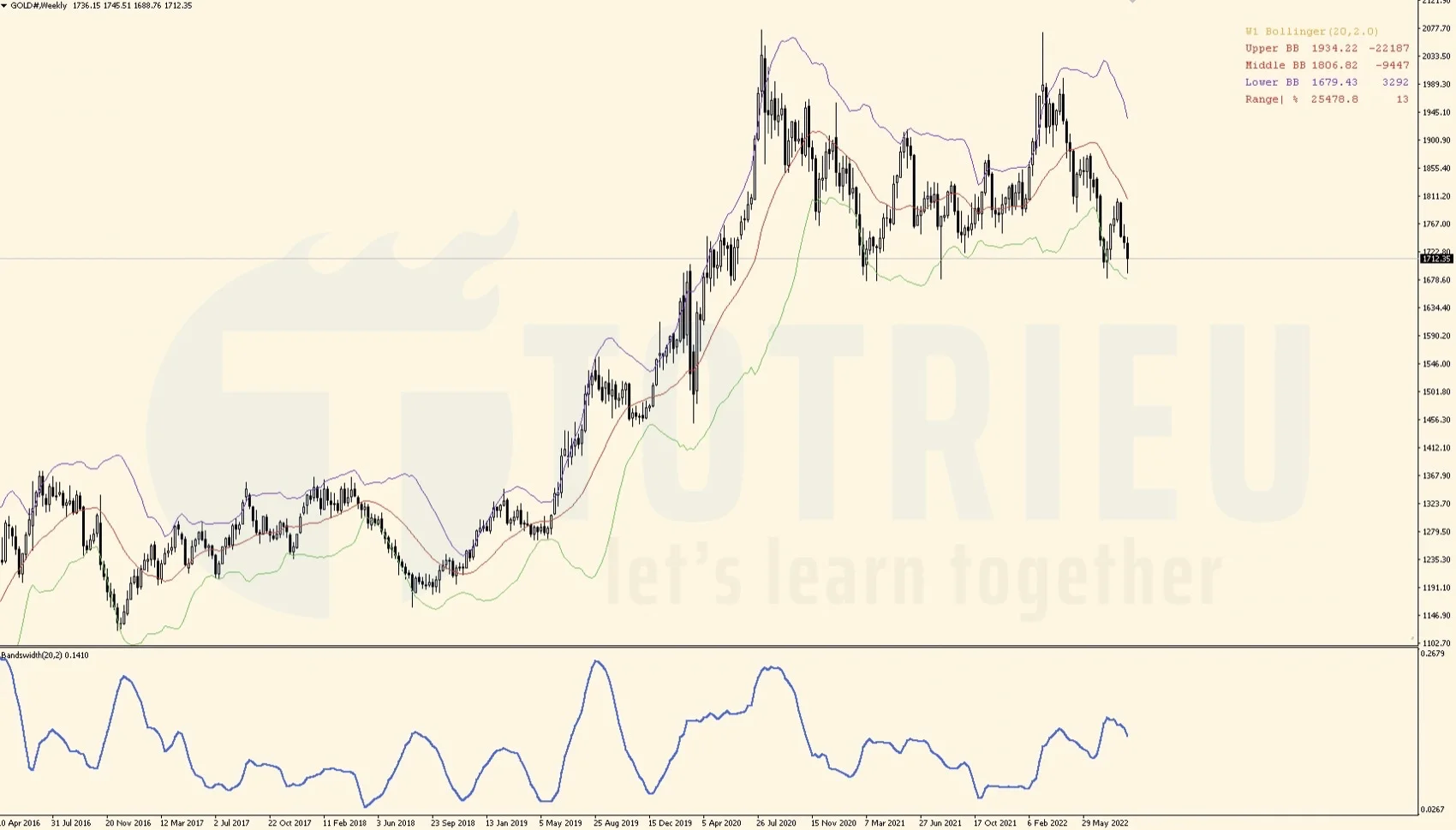 Band dưới tại $1668/oz đang là hỗ trợ khi Vàng sụt giảm mạnh vào tháng 07-2022 nhưng ngai lập tức rebouce khi tiếp cận band dưới.