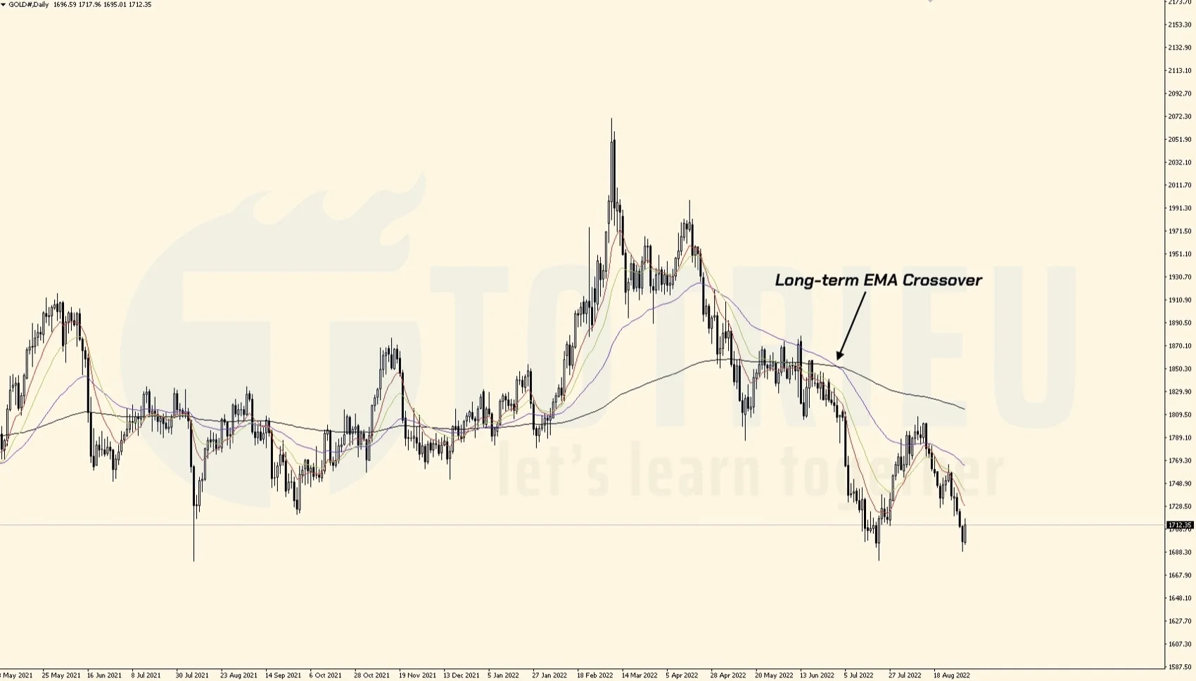 Khung ngày có tín hiệu Long-term EMA Crossover ở vùng giá $1850 và chưa có dấu hiệu giao cắt ngược trở lại.