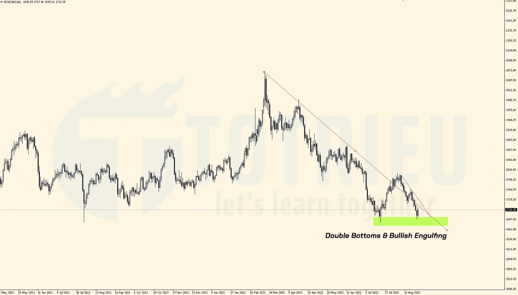 Tôi nhận thấy Mô hình 2 đáy – Double Bottoms đang xuất hiện. Cùng với đó là Cụm nến nhấn chìm tăng trưởng nhưng trong hình thái thực sự đáng quan ngại. Trong trường hợp có thể phục hồi theo Bullish Engulfing, Vàng có thể phục hồi về $1756.