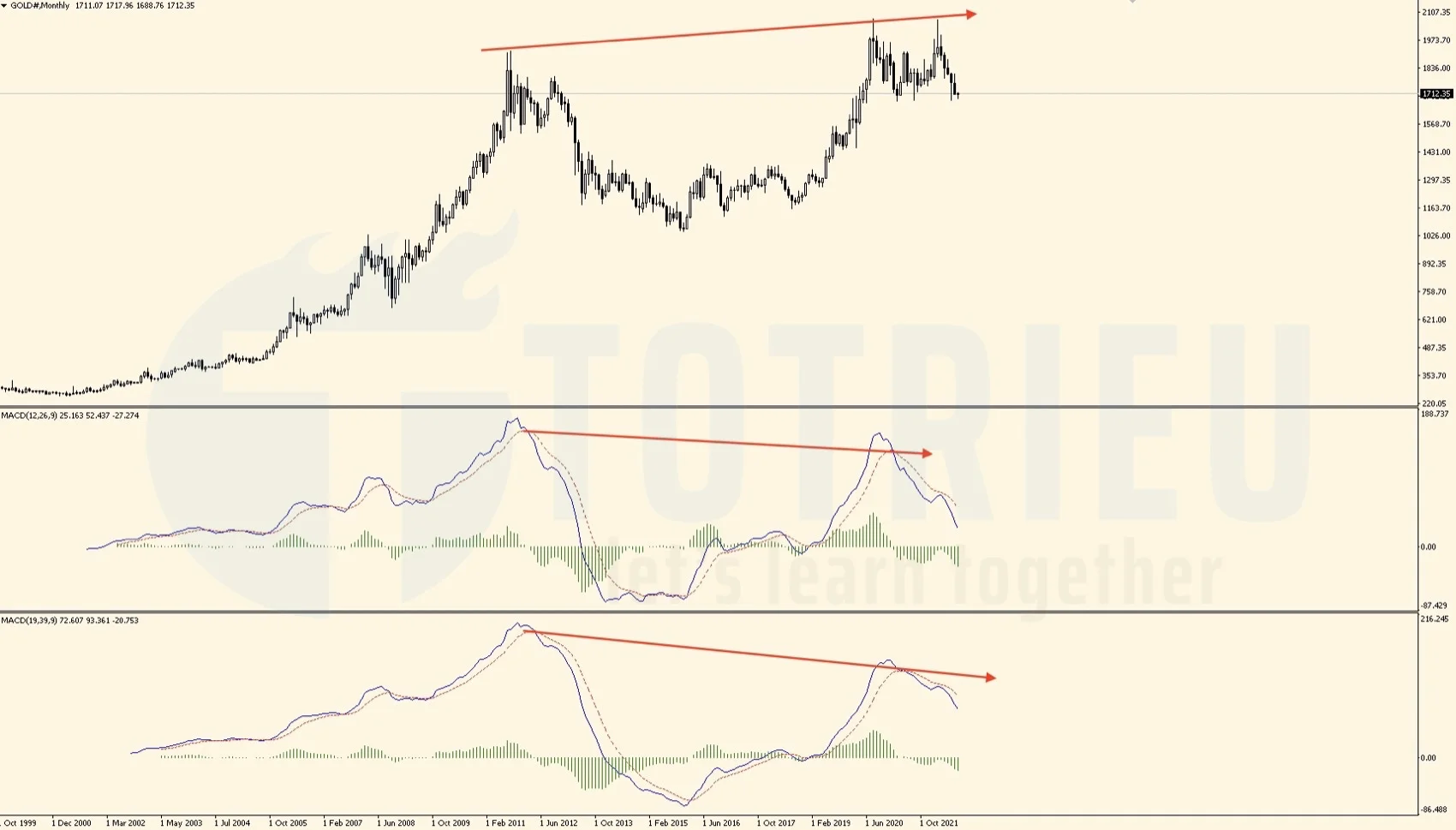 MACD cho tín hiệu Phân kỳ giảm giá điều chỉnh sau khi Vàng vượt ngưỡng đỉnh của năm 2011. Với tín hiệu này, Vàng hiện tại vẫn là Uptrend dài hạn.