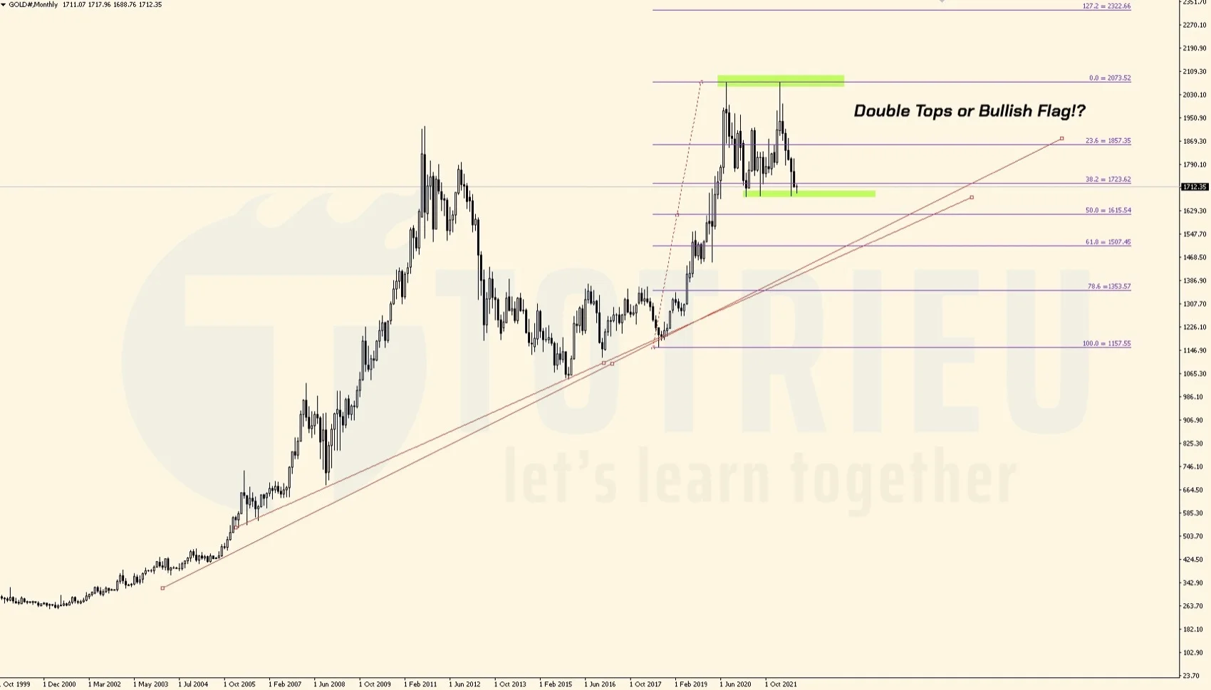 Có hai Mô hình đang cùng xuất hiện trên Khung tháng của Giá Vàng: Mô hình Double Tops và Mô hình Bullish Flag. Đáng buồn khi đây là 2 mô hình có xu hướng biến động trái ngược nhau.