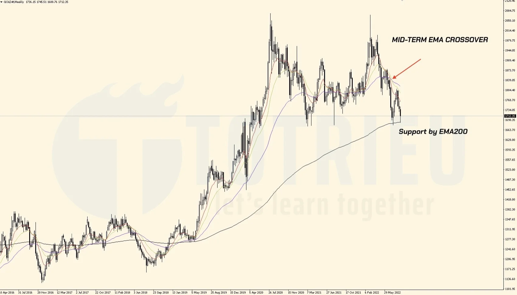 EMA50 trung hạn đang là hỗ trợ đáng kể với tín hiệu hiện tại, Tháng 09-2022 Vàng có nguy cơ sẽ còn đợt sụt giảm về EMA50 trước khi các phản ứng rõ ràng hơn xuất hiện.