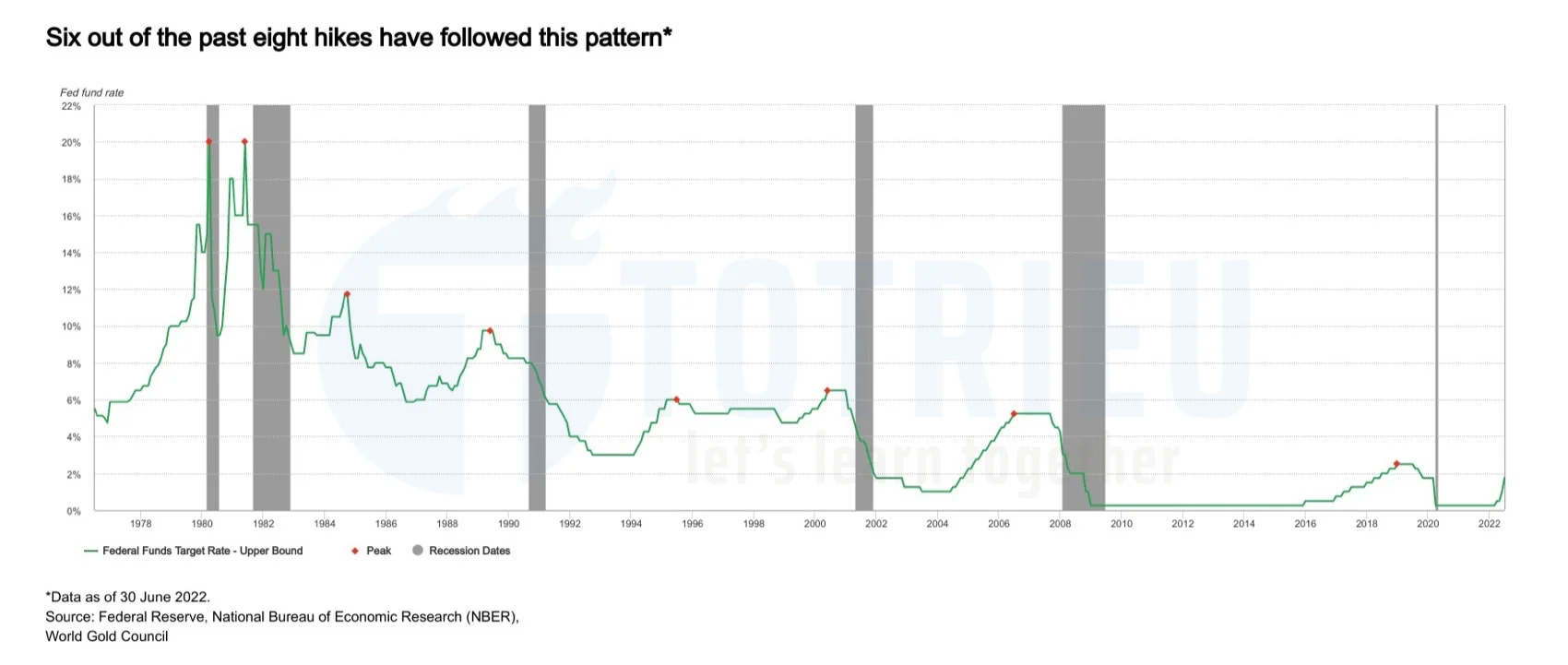 Mô hình được thống kê bởi World Gold Council cho thấy 6 trong 8 lần FED thực hiện tăng lãi suất thì 8-12 tháng sau đó là Suy thoái kinh tế. Lần gần nhất là vào năm 2018, FED thực hiện tăng lãi suất 4 lần thì năm 2020, cùng với COVID-19, Kinh tế Hoa Kỳ đã suy thoái rất sâu.
