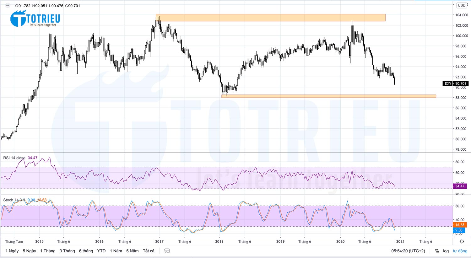 Kể từ tháng 03-2020, đồng USD đã sụt giảm khoảng 11.76%. Chỉ số sức mạnh đồng USD là DXY đã giảm từ mức 102 vào ngày 02-03-2020 xuống 90.70 vào ngày 04-12-2020.