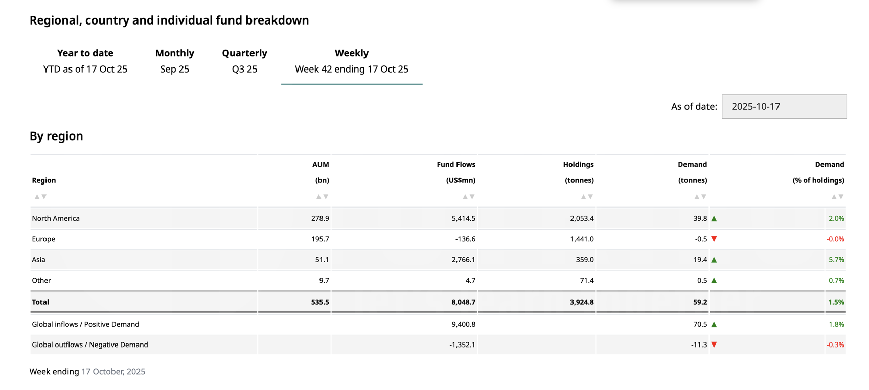 Khu vực Bắc Mỹ dẫn đầu làn sóng mua vào với 39.8 tấn trong tuần qua, chiếm gần 70% tổng dòng vốn toàn cầu. Động thái này phần lớn đến từ các quỹ ETF lớn như SPDR Gold Shares (GLD), vốn ghi nhận dòng vốn ròng tăng 46.93 tấn và nắm giữ tổng cộng 1,058.66 tấn vàng.