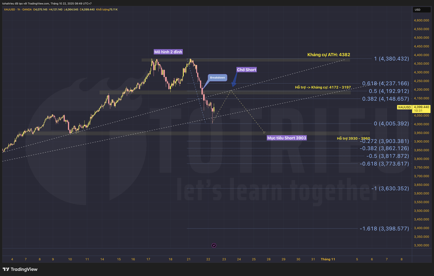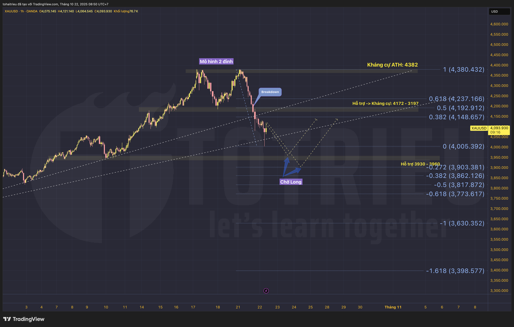 Nếu giá không thể phục hồi lên trên vùng R1 ($4,172-$4,197) trong 1–2 phiên tới, xác suất test xuống S2 ($3,930-$3,960) là rất cao. Ngược lại, nếu giá breakout trở lại trên R2 ($4,264-$4,281) với volume mạnh, mô hình 2 đỉnh có thể bị “failed pattern” và xu hướng tăng sẽ được khôi phục.