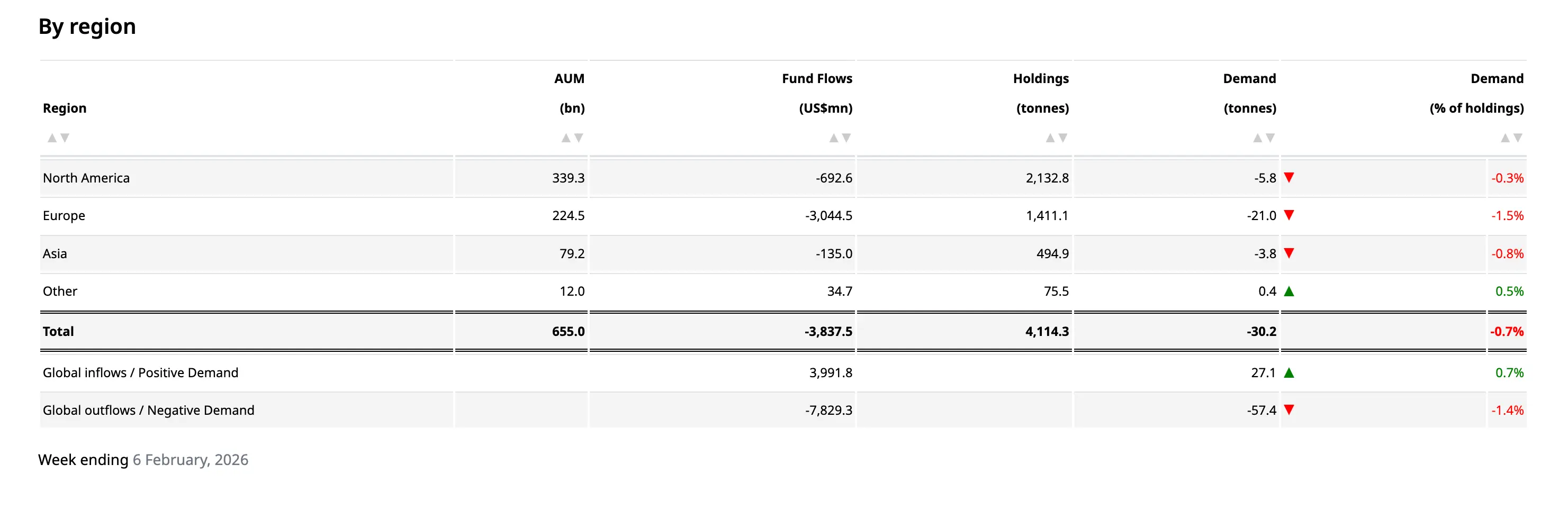 Tổng dòng vốn rút đạt hơn 57.4 tấn trong khi nhu cầu mua chỉ đạt 27.1 tấn và tổng chung cả tuần, các quỹ bị rút ròng khoảng 30.2 tấn.