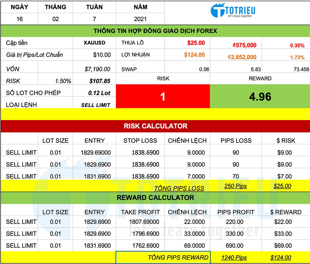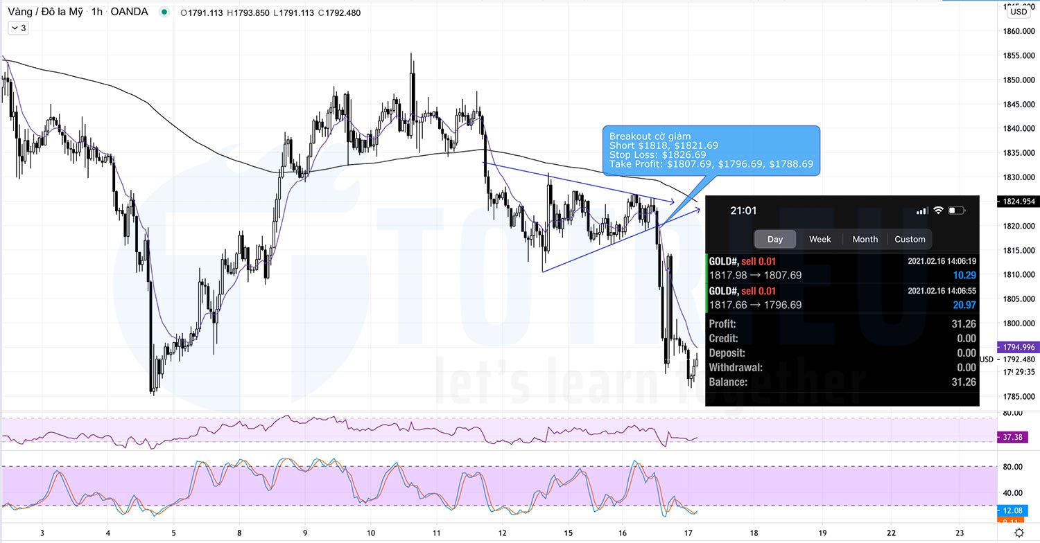 Giao dịch tại $1821.69 không thể thực hiện vì giá không quay về kiểm tra lại hỗ trợ cờ giảm mà giảm luôn.