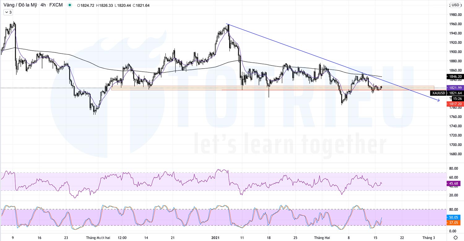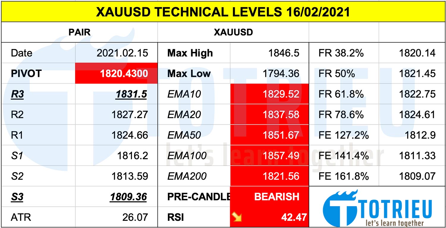 Giá Vàng – XAUUSD ngày 16-02-2021 đang biến động trong vùng tranh chấp hỗ trợ biên độ từ $1816 – $1826/oz.