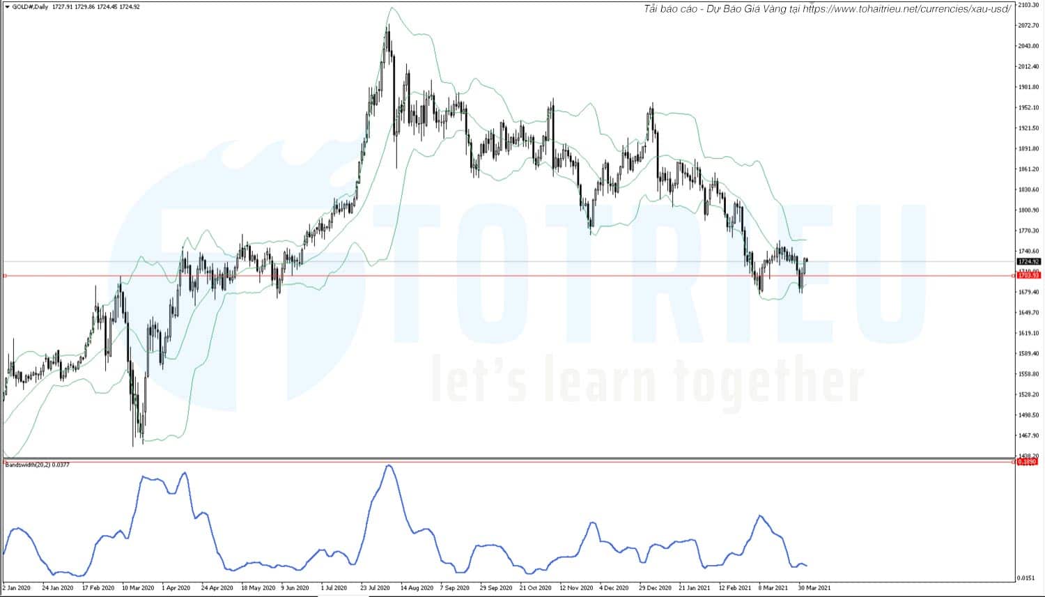 Bollinger Bands trên biểu đồ D1 của XAUUSD quý 2 năm 2021 cho chúng ta tín hiệu chi tiết.