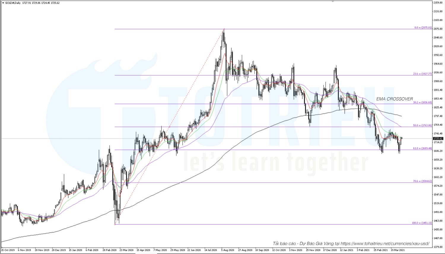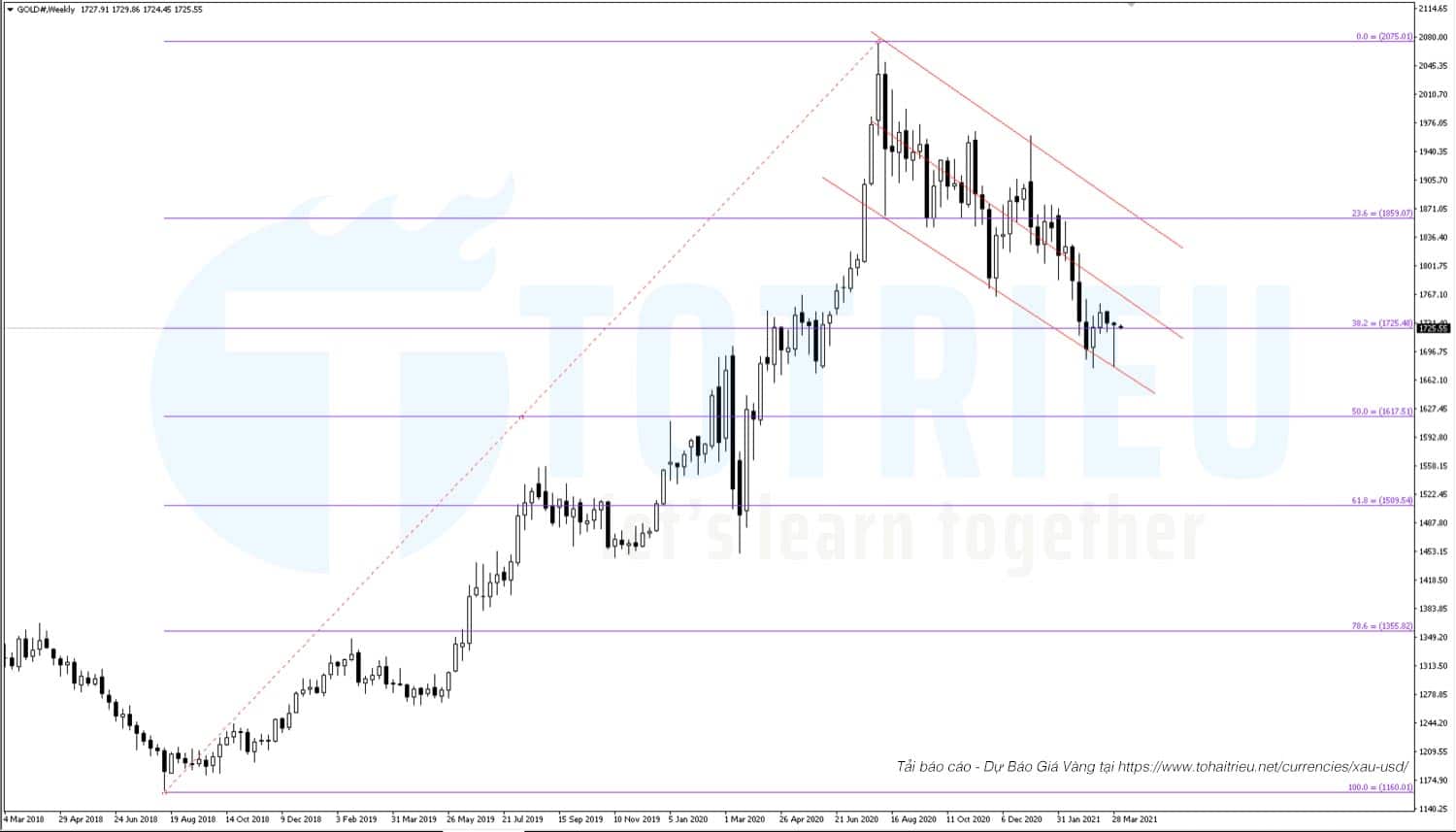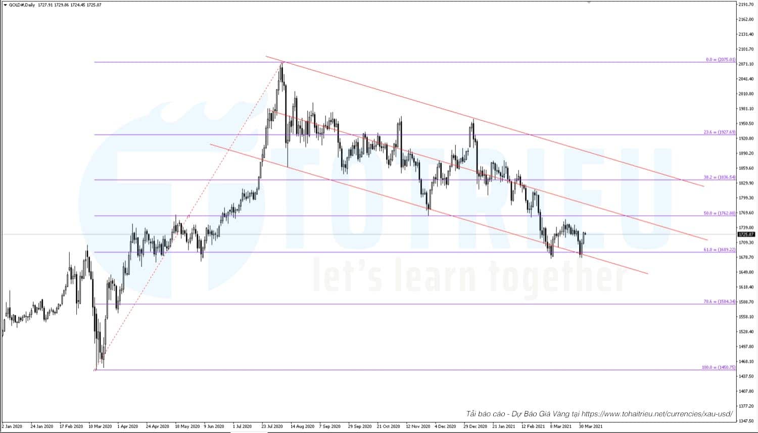 Với hình thái này, Chúng ta có thể kỳ vọng XAUUSD quý 2 năm 2021 sẽ biến động trong phạm vi từ Fibo 23.6% cho tới Fibo 50% ở $1617.69/oz.